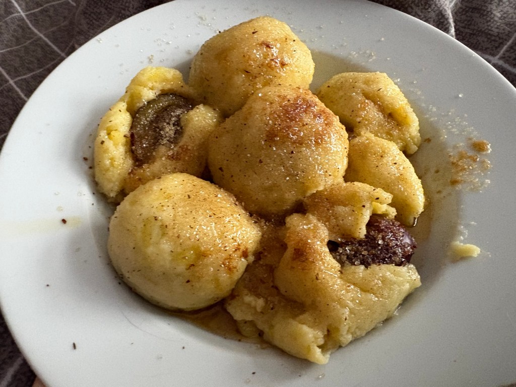 Irgendwo zwischendrin mache ich eine Pause und bereite mir Pflaumenknödel zu, aus Kartoffeln, Mehl und TK-Pflaumen, dazu Butter, Zimt und Zucker.