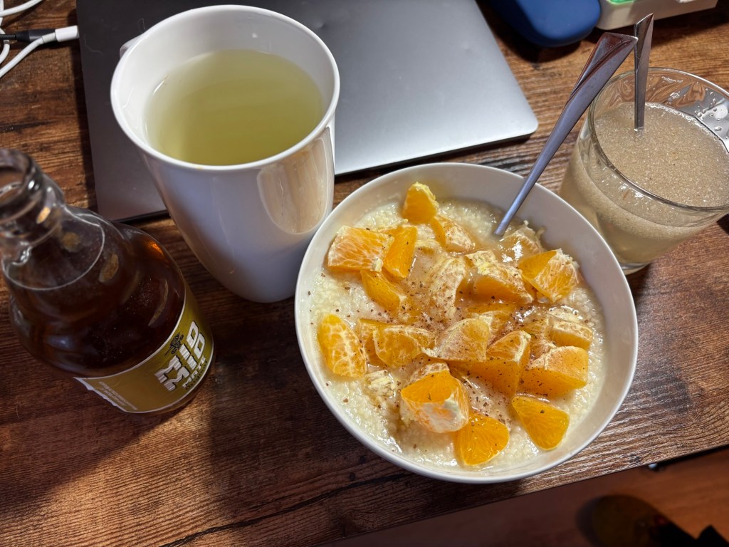 Hirsebrei mit der schon wieder letzten Orange und Zimt, Zitronenwasser mit Flohsamenschalen, Thymian-Ingwer-Tee, Mate