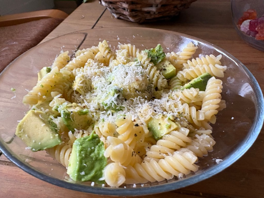 Es folgen wieder Stunden emsigen Fleißes. Nach einem Call schon in der Mittagszeit verschwinde ich in die Küche und mache mir Pasta mit Avocado.