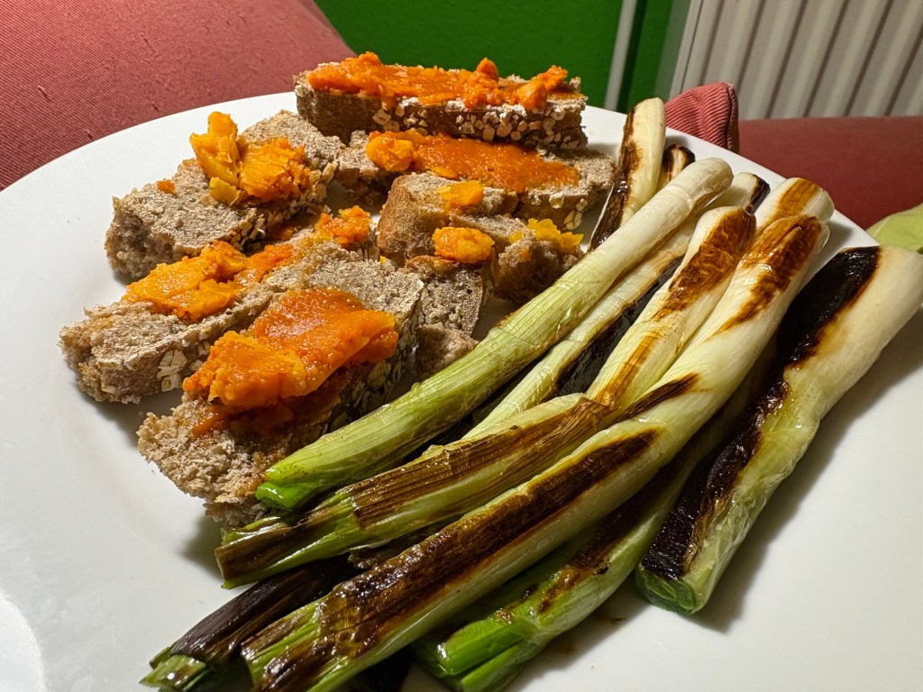 Die zieht sich dann nochmal bis 19 Uhr. Da wäre nochmal ein Webinar, aber das lasse ich wie gestern auch sausen – Kopf ist zu. Stattdessen kümmere ich mich ums Abendbrot und bereite die andalusischen Calçots, die in der Crowdfarming-Kiste waren, einigermaßen authentisch zu – in der Pfanne statt auf dem Grill und daher etwas besser geputzt vorher. Dazu selbst gebackenes Brot und Knoblauch-Tomatenbutter statt der klassisch dazu gereichten Romesco-Sauce. Kann man gut machen!