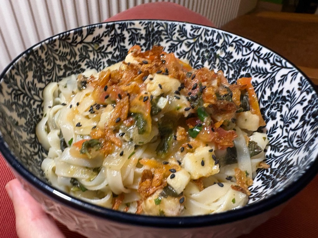 Um die Mittageszeit gibt es Webinare, das letzte verfolge ich am Ende nur noch akustisch, während ich mir zum Mittagessen asiatische Weizennudeln koche – in Gemüsebrühe und mit Algen, TK-Spinat, Zwiebeln, Chili, Fischsauce und Limettensaft.