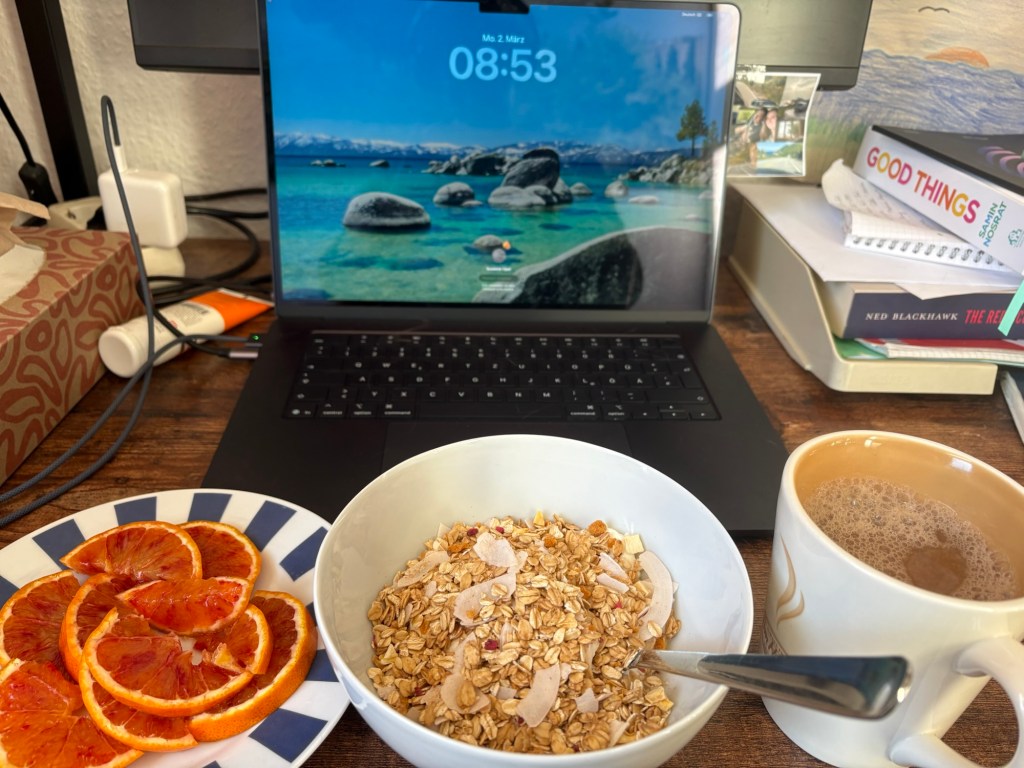 Zuhause dann erstmal Notfallprogramm: Der Laptop ist zum Glück trocken geblieben, anderes muss zum Trocknen auf die Heizung, Textiles inkl. Rucksack und Mantel kommt direkt in die Waschmaschine. Ich fülle das Müsli wieder in eine Schüssel um, gieße Milch nach (Höhö) und sitze dann ab kurz nach 10 mit voll funktionstüchtigem Equipment und Passwort endlich am Schreibtisch.