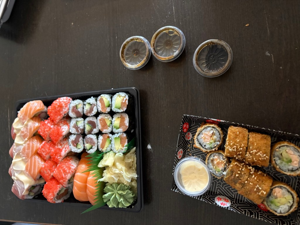 So vergeht der Nachmittag. Gegen halb 6 bestellen wir Sushi für das Teilzeitkind und mich und gebratene Nudeln mit Ente und Tom Kha für den Liebsten. Dann Abendbrot und Ruhepause.