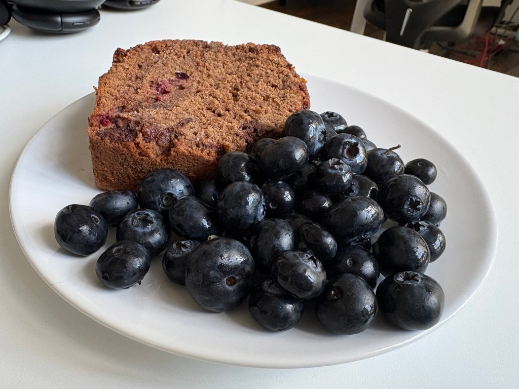 Ich nutze die Bahnfahrt für den Rest vom morgendlichen Reboot. Im Büro angekommen erledige ich schnell die erste Aufgabe des Tages, dann hole ich mir eine Mate und frühstücke Kuchen und Blaubeeren.