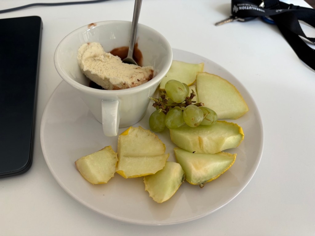 Der sizilianische Eisladen lockt, aber ich bleibe standhaft und bastle mir den Nachtisch im Büro – es ist noch selbst gemachtes Vanille- und Schokoeis vom Kollegen da, außerdem Obstreste vom Dienstagsfrühstück. Dazu mehr Tee.