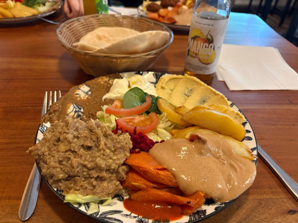 Foul-Teller mit Salat, Süßkartoffeln, Kartoffeln, Hummus, Erdnusssauce, Mangosauce, scharfer Sauce und verschiedenen Pasten