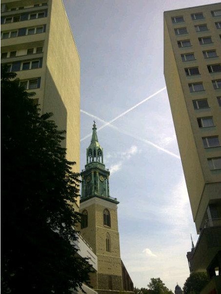 Da gerade alles über 9/11 spricht, erhält dieser Schnappschuss von heute Nachmittag irgendwie nochmal eine Meta-Ebene. Zwei „Türme“ (in Wirklichkeit stinknormale Ostberliner „Neubauten“), zwei Flugzeuge, die am Himmel ein Kreuz hinterlassen haben, das die beiden Türme mit der Kirche (der Religion) verbindet. So sah der 11. September 2011 in Berlin aus. Auf dem Alex demonstrierten Nazis, wofür der gesamte Platz abgesperrt wurde, ein paar Gehminuten davon entfernt hat man davon gar nichts mehr mitbekommen. Gleichzeitigkeit, Vielfalt, Perspektivenwechsel.