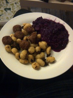 Dieser November sieht zwar bisher eher sonnig und warm aus – so sonnig, dass ich mir nach dem Mittagessen einen Frozen Yoghurt mit Himbeeren, Mango und Granatapfel gönnte, aber gegen Abend wurde meinem Gaumen doch winterlich zumute. Daher gab es Vegetarische Bällchen (ja, die heißen so), Gnocchi, Steinpilze und Apfelrotkraut. Alles Convenience, aber es musste ja schnell gehen und lecker war es trotzdem.