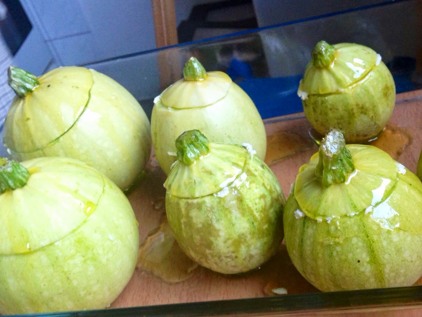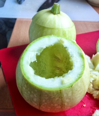 Ich hatte hier bereits versprochen, noch von unserem Sonntagabend-Mahl zu berichten. Am Freitag gab es auf dem Markt kleine runde Zucchini und weil ich die bisher immer nur aus diversen Kochblogs kannte, habe ich gleich den gesamten Vorrat aufgekauft, um endlich einmal gefüllte Zucchini machen zu können, bei denen auch richtig was reinpasst – geht mit den länglichen natürlich auch, aber das find ich dann optisch nicht so den Bringer.