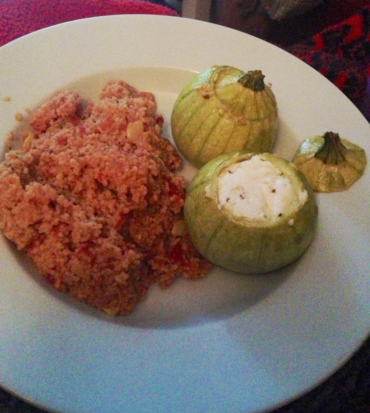 Während ich so vor mich hin plantschte, kümmerte sich der Mann um die Beilage und briet die Zucchini-Innenleben in der Pfanne an, löschte mit Konserven-Tomaten (stückig, ausm Tetrapak, und zwar die guten aus Bella Italia) ab und würzte ordentlich, inklusive Basilikum. Dann kam der vorbereitete Couscous dazu und am Ende hatten wir also diese Leckerei auf dem Teller – Mann und Gast waren begeistert, ich war zumindest sehr zufrieden.