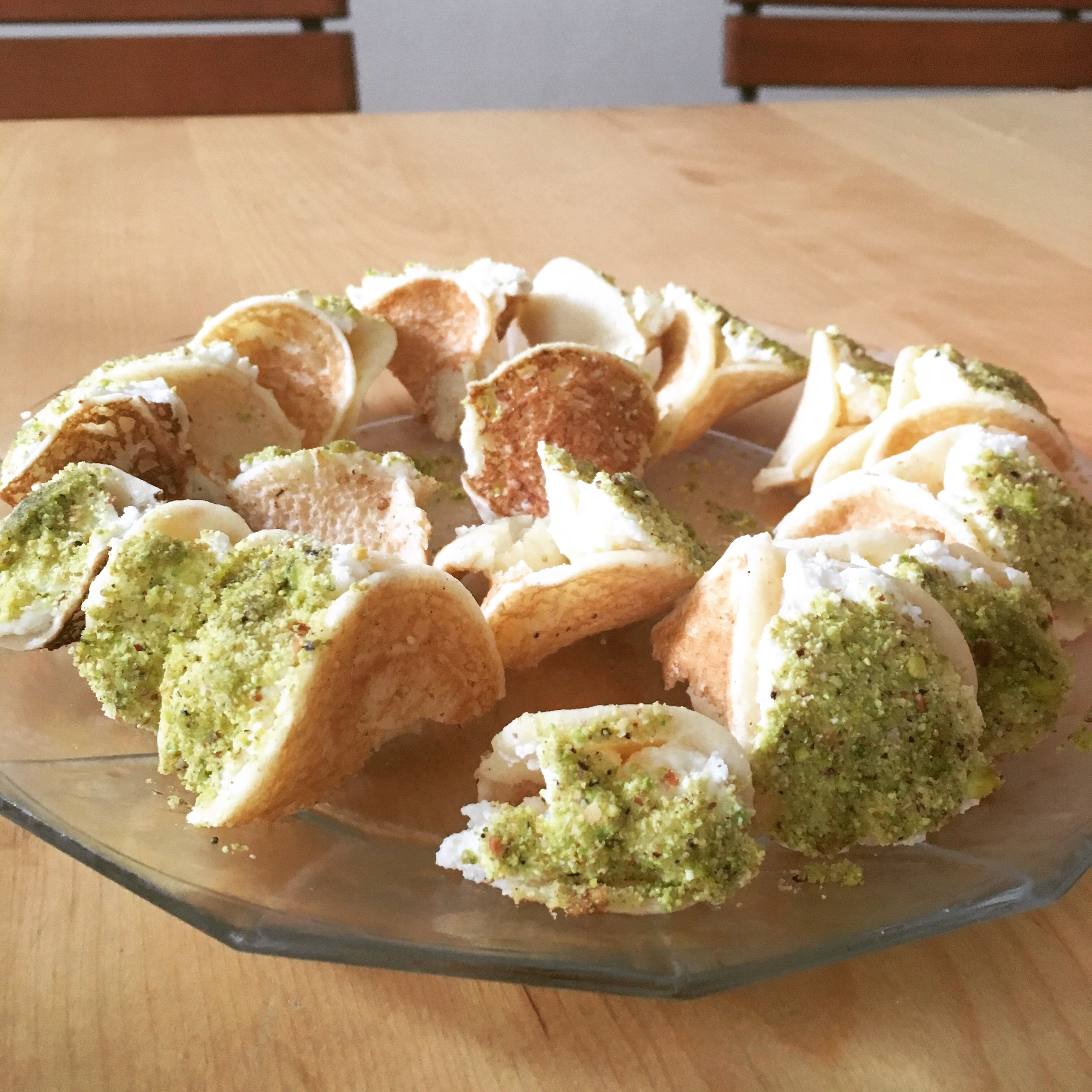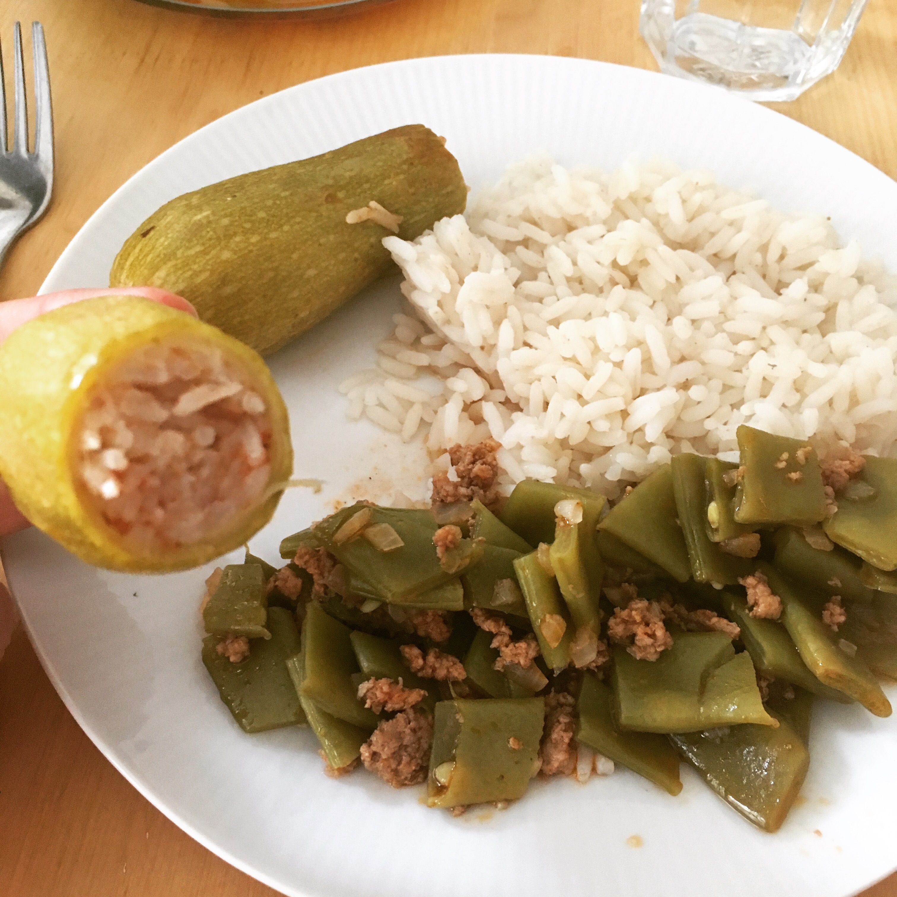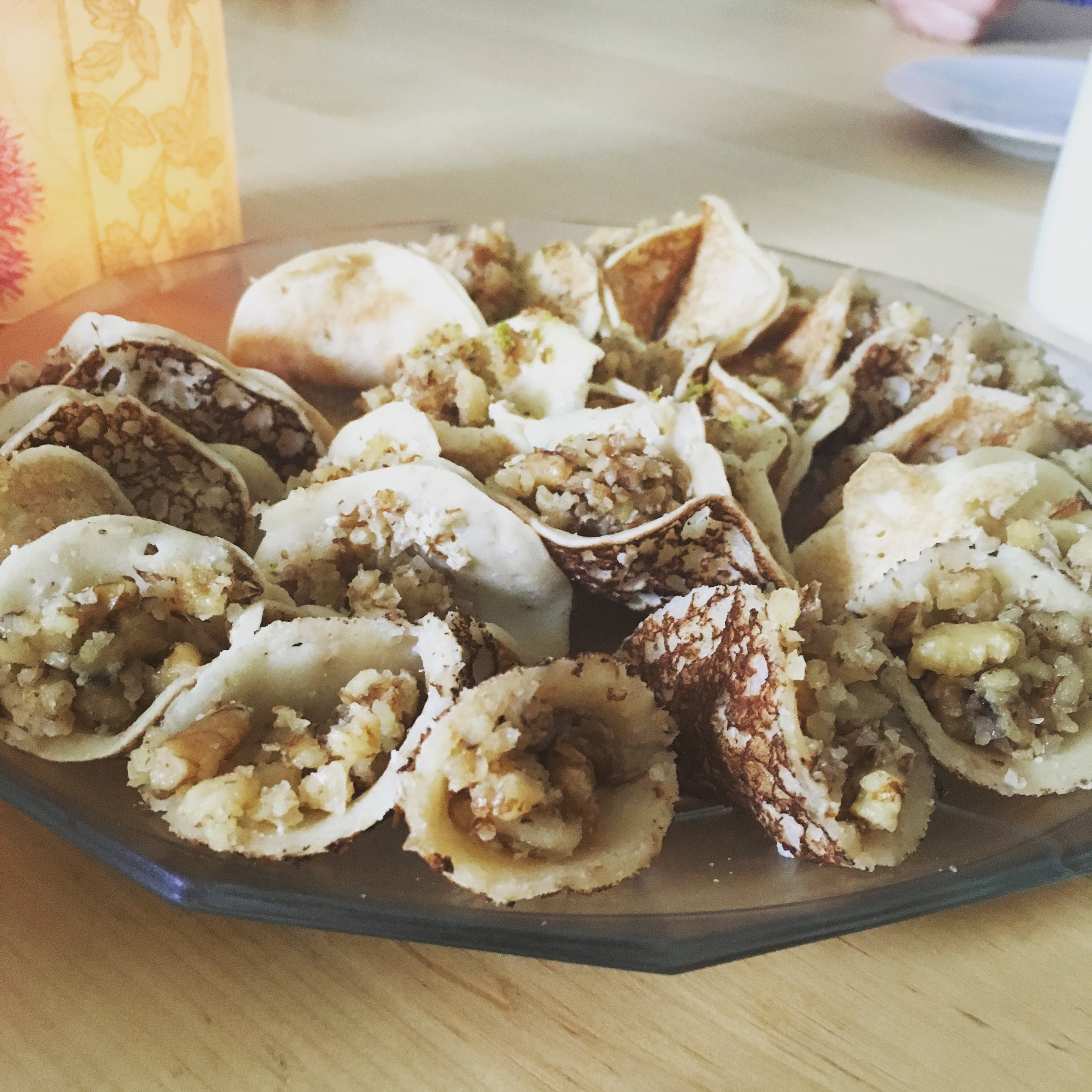 Mit Mühe schaffe ich es vom Sofa an den Esstisch. G. serviert heute gefüllte geschmorte Zucchini, die sehr interessant gewürzt sind und mit den Fingern gegessen werden, außerdem einen Gericht aus Zuckerschoten und Hackfleisch mit Reis. Zum Nachtisch gibt es unsere Melone sowie zwei verschiedene Süßigkeiten. Kleine runde Pfannkuchen werden an einer Seite zusammengedrückt wie Tüten. Die andere Seite wird gefüllt – einmal mit einer Creme und gehakten Pistazien, einmal mit Walnüssen. Über beide Varianten wird flüssiger Honig gegossen. Irgendwann zeigt G. mir, wie man das alles zubereitet, hat er versprochen.