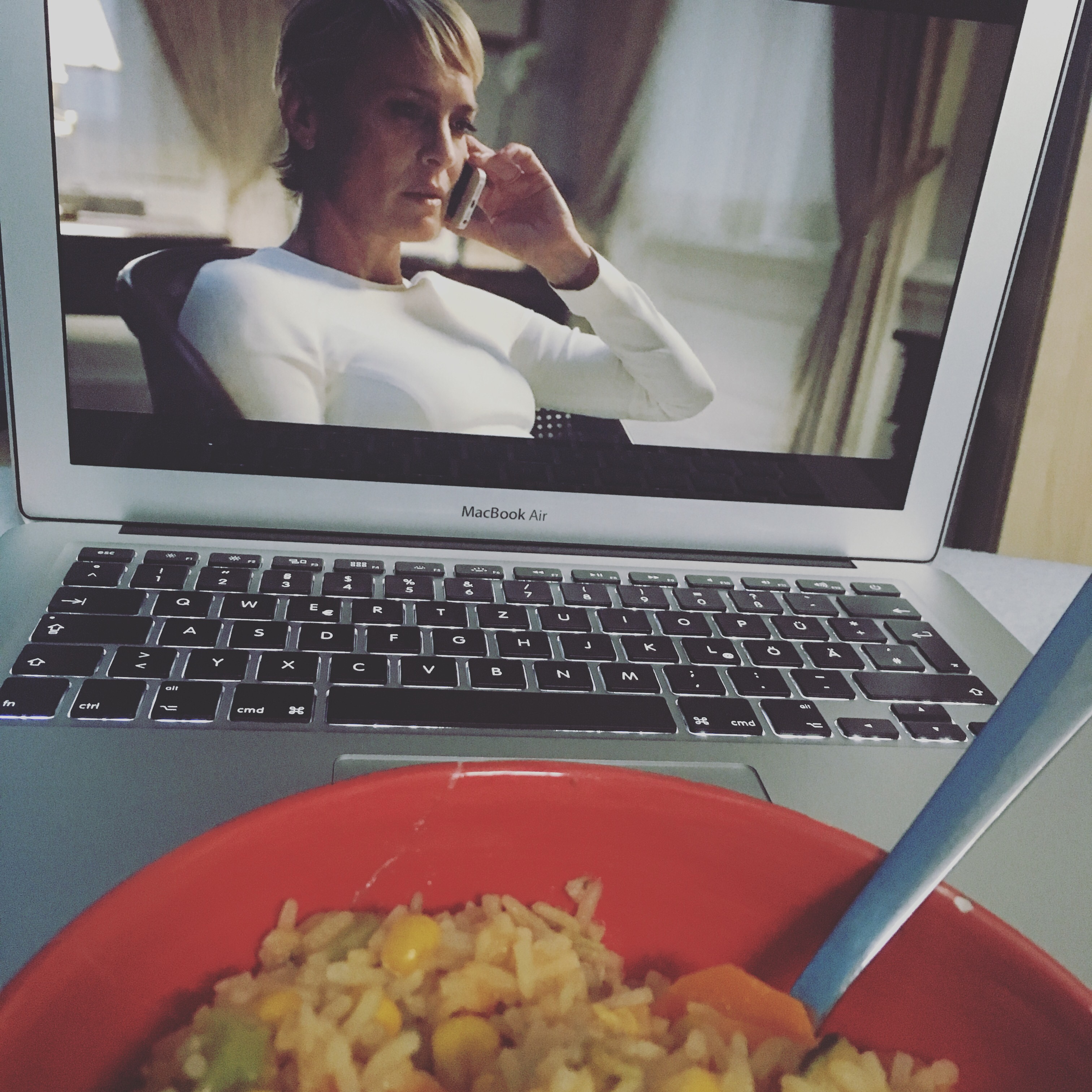 Ich schaue auf Netflix Blue Valentine und dann mehrere Folgen House of Cards. Irgendwann zwischendurch kommt der Hase mit unserem heutigen Übernachtungsbesuch nach Hause, der von einem Wochenendtrip nach Riga zurückgekommen ist und erst morgen weiter nach Hause fährt. Da ich immer noch liegen muss, schauen die beiden alleine einen Film und bringen mir zwischendurch noch ein wenig aufgewärmte Reis-Gemüse-Pfanne.