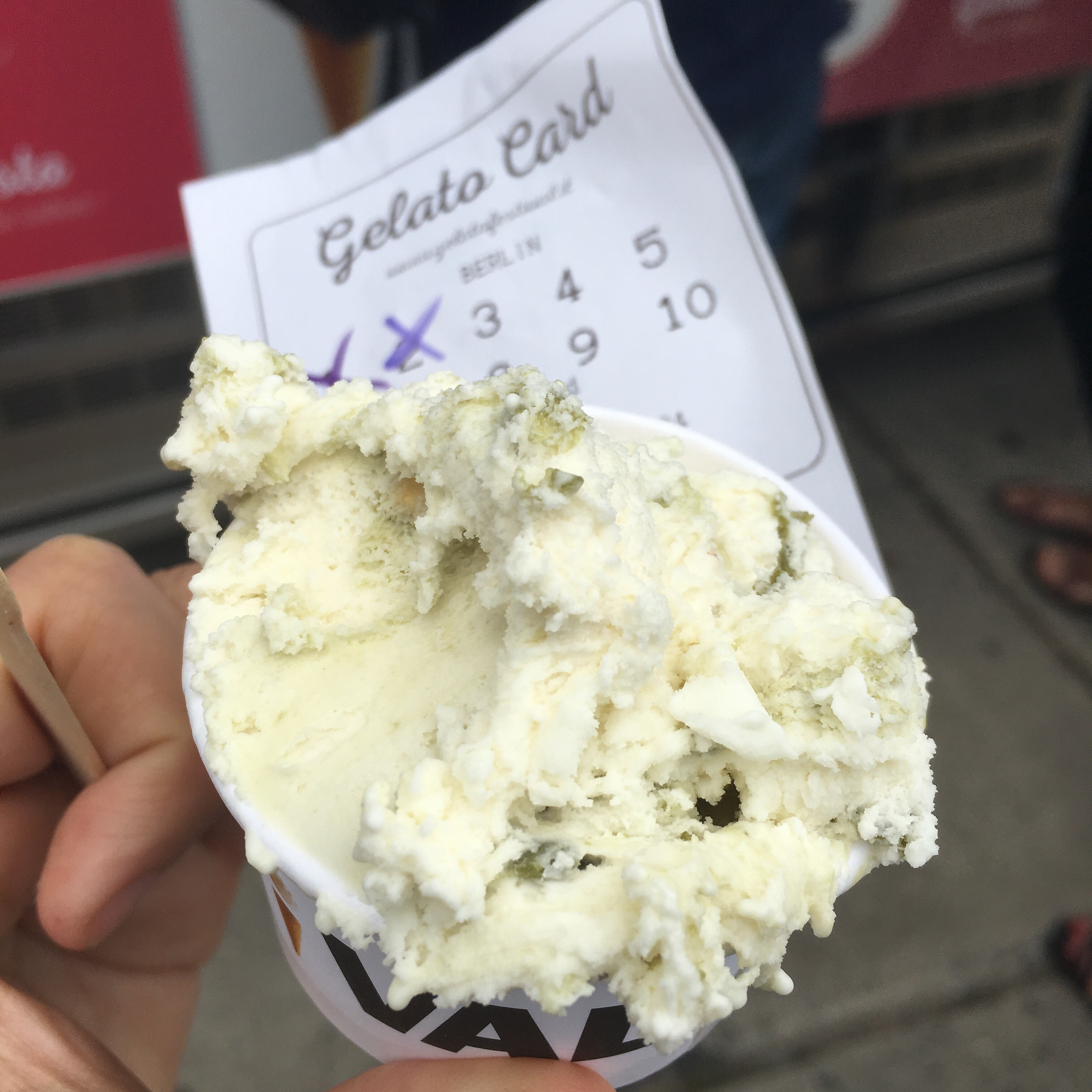 Direkt daneben und deutlich ruhiger dann Nummer 6, der Favorit von mir und der Freundin: das „Mediterraneo“ vom Erste Sahne in Neukölln (von Berlin aus: im In-Bezirk, südlich der Hasenheide). Ein veganes Sorbet aus Bronté-Pistazien, parfümiert mit Orangenblütenwasser, mit kalabrischem Olivenöl aus der Produktion des Vaters des Gelatiere, Karamellsauce und getoasteten Mandeln. Wundervoll, leicht, cremig, unglaublich aromatisch und auch der klare Sieger der beiden Pistazieneis-Variationen. Wie schön, dass mein Favorit auch der für mich am verkehrsgünstigsten gelegene ist, da schauen wir demnächst nochmal vorbei!