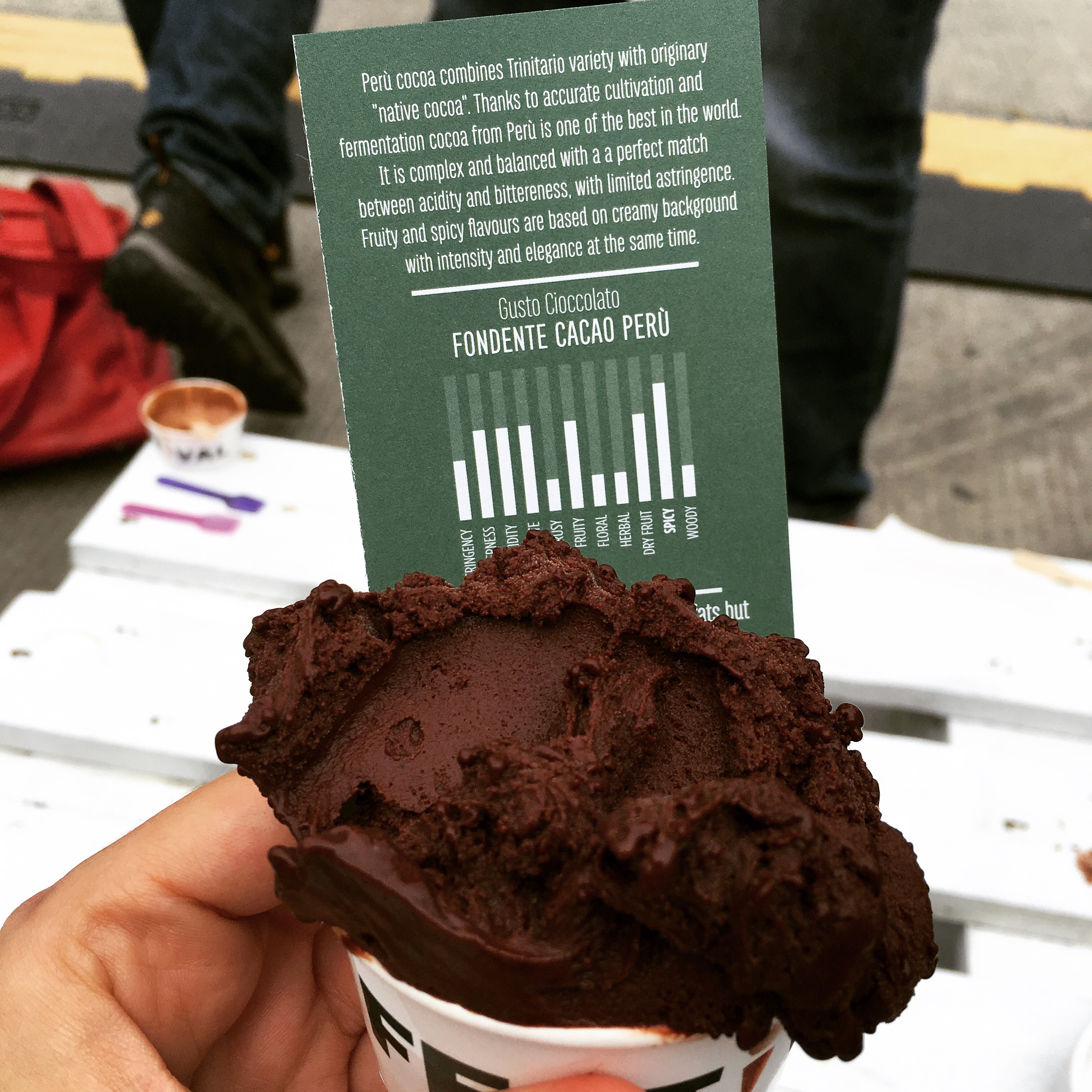Dort, bei Pernigotti, gab es nämlich fünf verschiedene wundervolle Schokoladeneissorten mit herkunftsreinem Kakao aus Santo Domingo, Ecuador, Peru, Sao Tomé oder Kuba. Ich entschied mich mit Peru für die dunkelste Schokolade aus 80%igem Kakao und wurde nicht enttäuscht. Enttäuscht war ich eher darüber, dass man uns Nummer 8 vorenthalten hatte, obwohl uns angeboten wurde, einfach noch eine weitere Portion eines anderen Eises zu kosten, was wir aufgrund mangelnder Magenkapazitäten dann doch abgelehnt haben. Ich hätte gerne zum Abschluss nochmal ein leichtes, fruchtiges und nicht zu saures Sorbet gehabt, um eine Balance zur Schokolade zu schaffen. Aprikose, weiße Traube oder Feige wäre toll gewesen. So ein ausgleichendes Eis fehlte mir auch insgesamt ein bisschen in der Auswahl und ich war fast versucht, auf dem Heimweg noch irgendwo anzuhalten. Die Vernunft siegte dann aber doch und so stimmten wir nur noch schnell ab und rollten dann unsere eisigen Bäuche nach Hause.