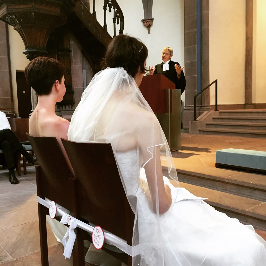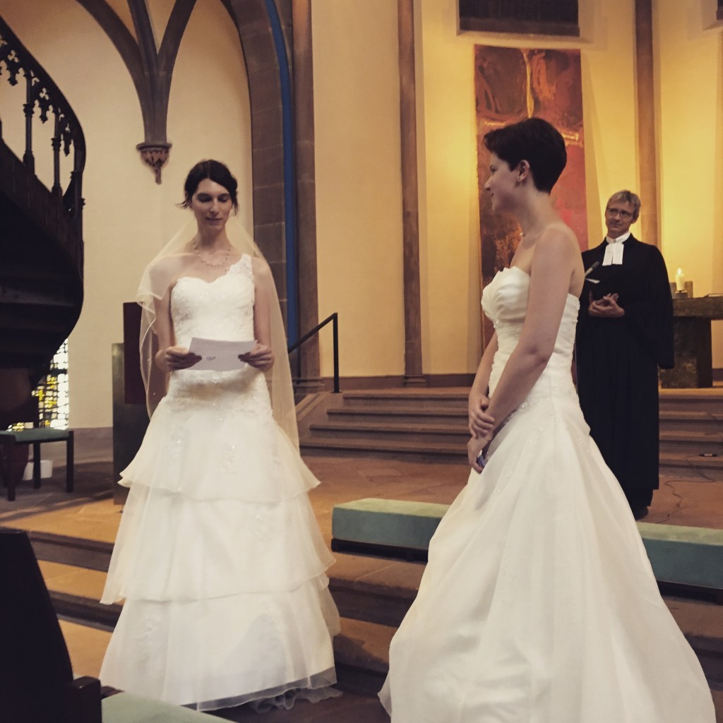 Der Pfarrer war nervös, aber enthusiastisch, als er am Samstag vor der Aufgabe stand, meine beiden Freundinnen kirchlich zu trauen. Nervös war er vor allem, weil der Gottesdienst zweisprachig, auf Deutsch und Französisch stattfinden würde, er selbst aber gar nicht Französisch sprach. Enthusiastisch war er, weil er sich gemeinsam mit dem Brautpaar im Vorfeld auf ein Science-Fiction-Thema für den Gottesdienst geeinigt hatte und er so Referenzen auf Star Wars und Star Trek in seine Predigt einbauen konnte. Dass das vor ihm stehende Paar aus zwei Frauen bestand und er somit die erste kirchliche Trauung eines lesbischen Paares in Offenburg durchführen würde, spielte in all dem nur noch eine sehr untergeordnete Rolle.