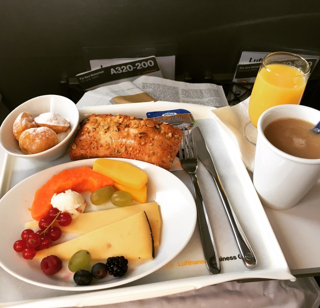 - auf dem Kurzstreckenflug Berlin-München, bei dem es in der Economy Class gerade mal ein paar Nüsse oder ähnliches gibt, ein komplettes Frühstück serviert bekommen