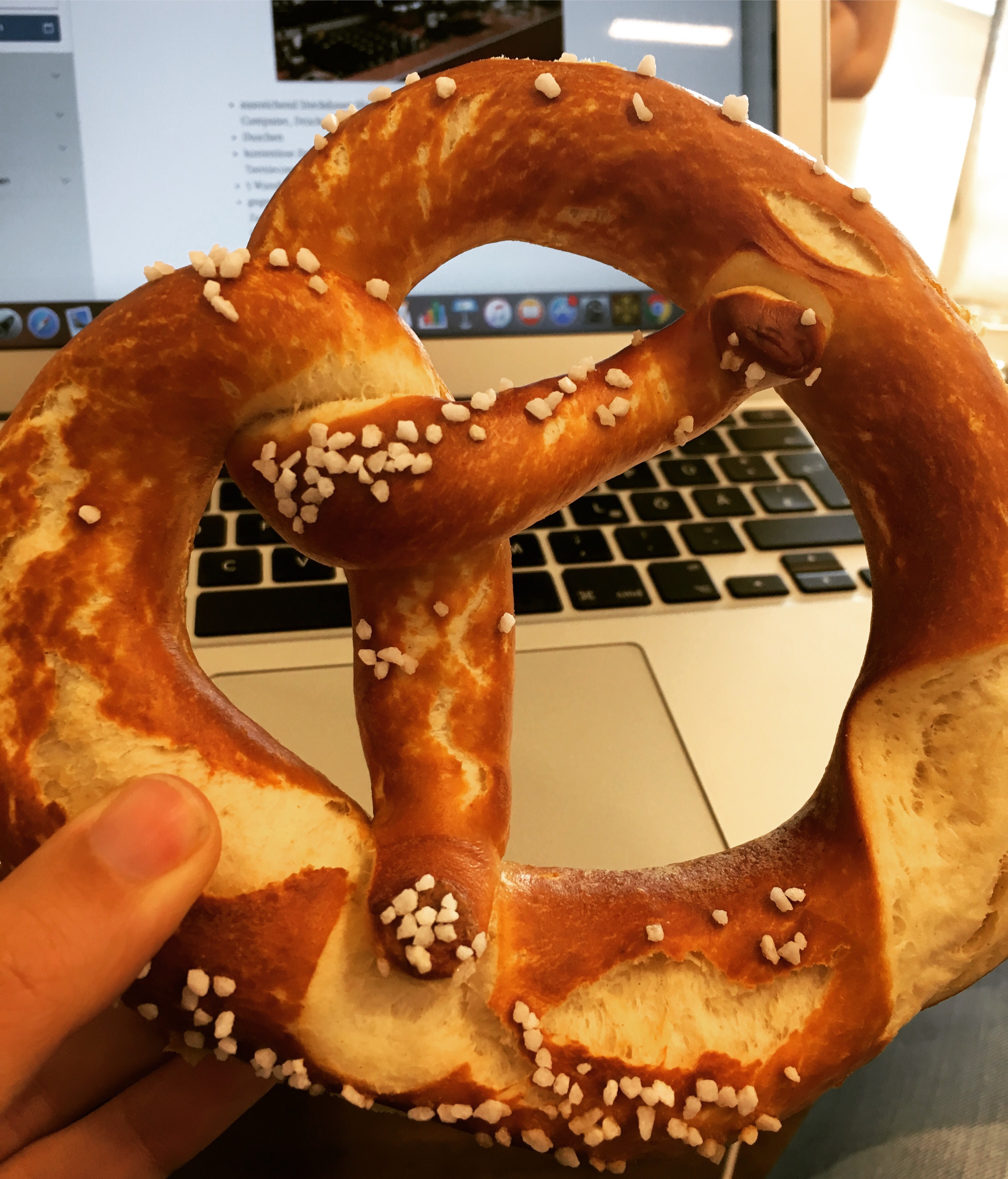 - gegen Mittag wechselt der Büffet-Inhalt – statt Rührei gibt es jetzt Leberkäs, Zucchini-Creme-Suppe, Brezn, Kartoffelsalat, Fleischpflanzerl, Grießbrei… Man könnte sich hier dumm und dämlich fressen, aber es gibt ja auf dem Weiterflug noch Mittagessen