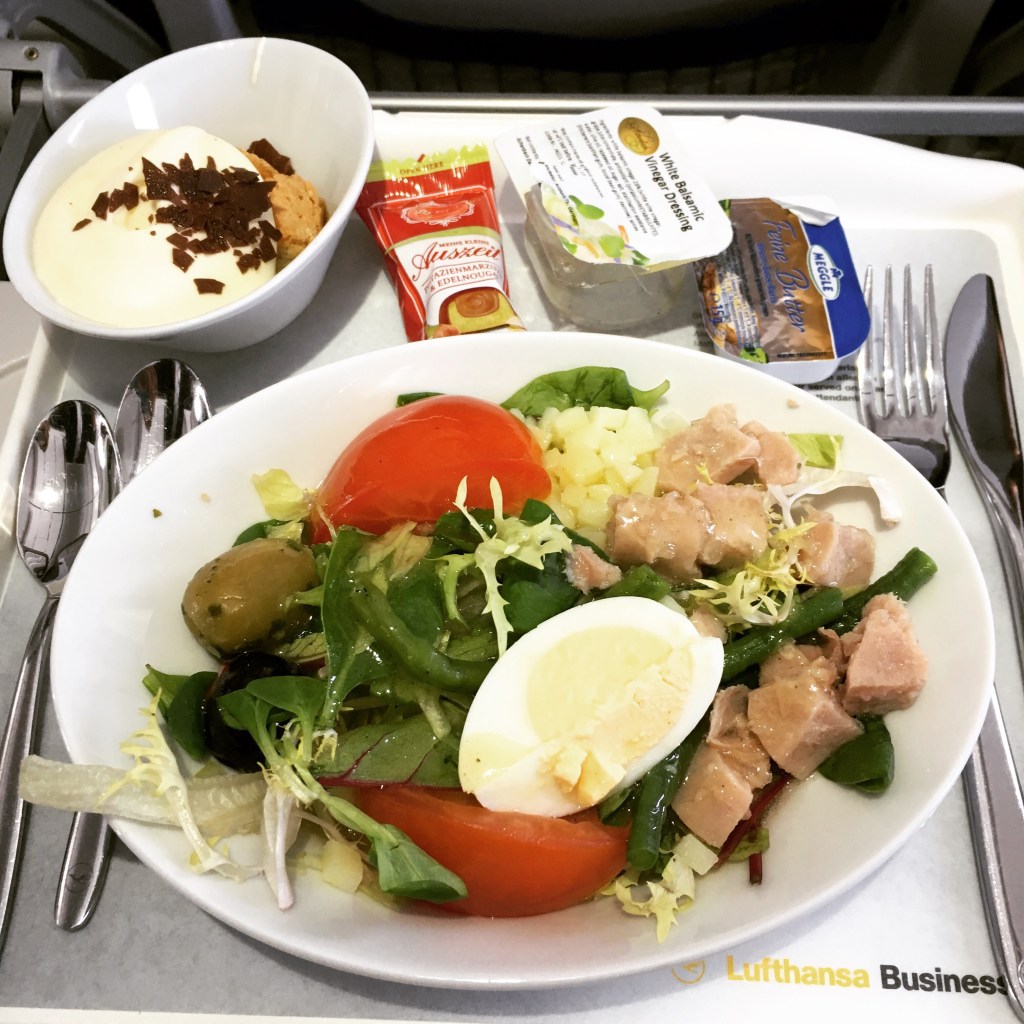- zum Mittagessen bei Flug 2 gibt es einen Salade Nicoise mit frischem Brötchen und ein Creme-Dessert mit Cantuccini, außerdem zwei Mozartkugeln