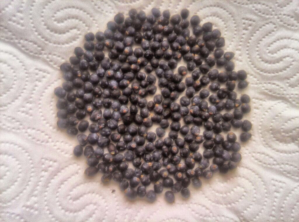 Ich streifte also eine große Hand voll Wacholder-Beeren (wann braucht man die schon mal) vom Baum und wusch und trocknete sie zuhause erst einmal, um den weißen Film herunterzubekommen. Auf einem Teller breitete ich ein Blatt Küchenkrepp aus und lagerte die Beeren zum Trocknen aus. Dort warten sie nun auf den richtigen Trocknungsgrad, um sie in einem Glas zu verstauen. So verpackt sollen sie mehrere Jahre haltbar sein.