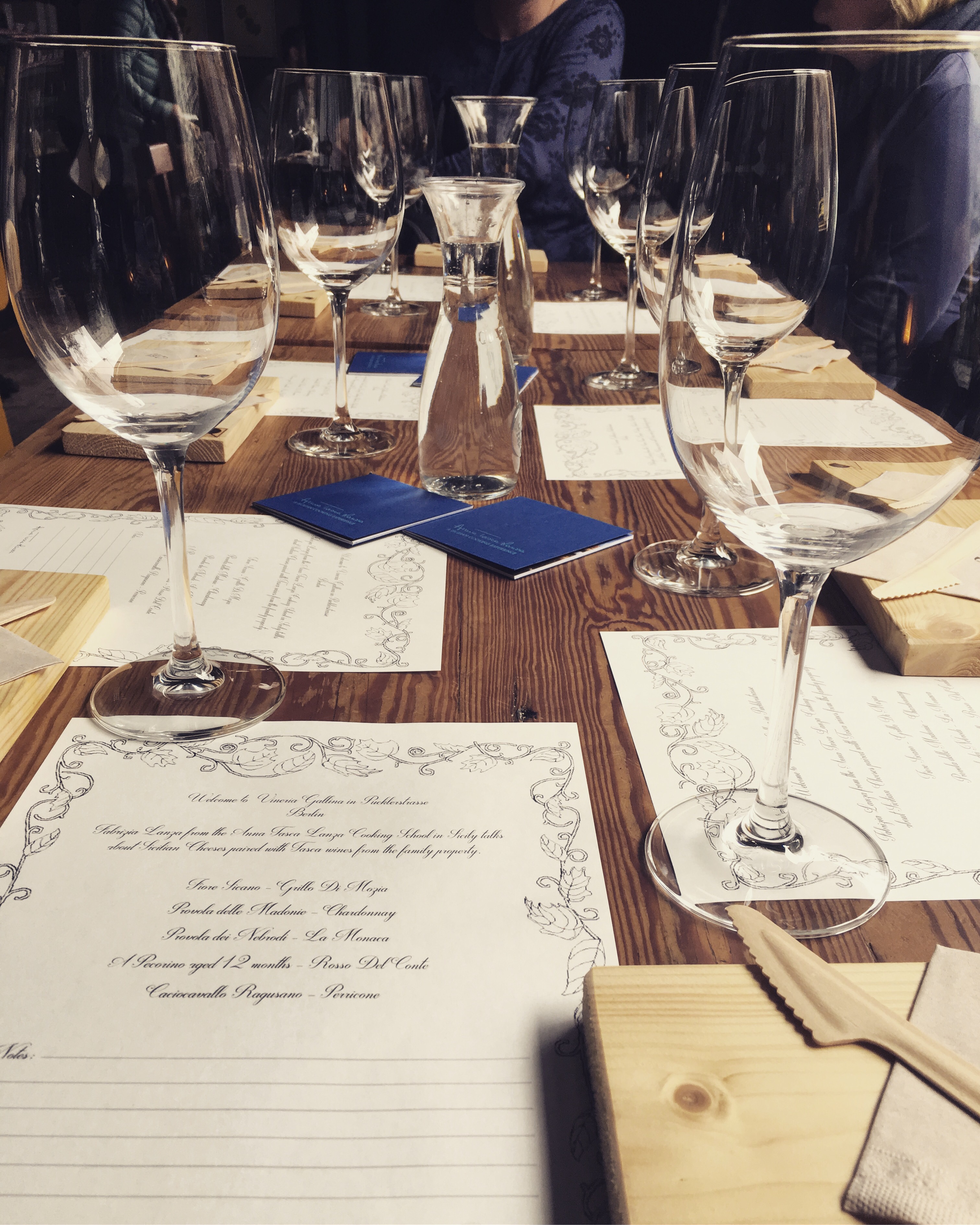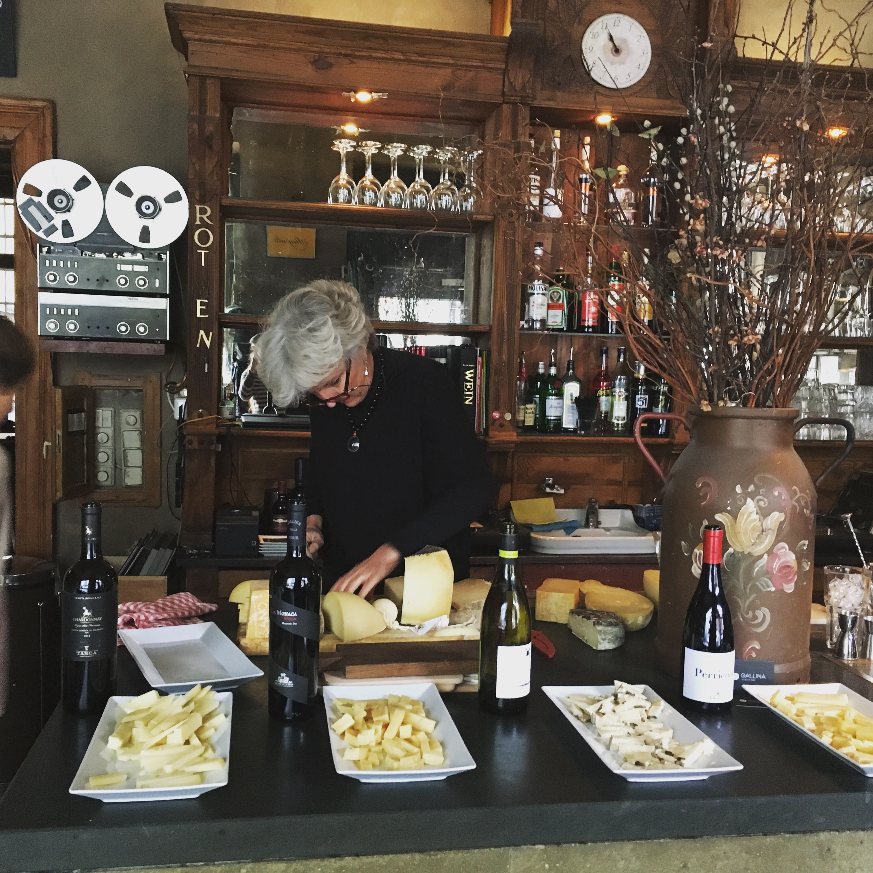 Heute war nun der Tag der eigentlichen Verkostung. Kurz vor 11 betraten wir die Vineria Gallina gegenüber der Markthalle Neun und wurden von Fabrizia freudig begrüßt. Man war gerade dabei, den Käse aufzuschneiden und die passenden Weine auszusuchen. Dazu waren ein Sommelier und der Vertreter der Tasca-Weine in Berlin anwesend. In der Familie Tasca ist es so, dass sich die Männer um die Weine kümmern und die Frauen ums Kochen. Fabrizia erklärte daher dann ganz pragmatisch: „It’s a cheese tasting, the wines do what the cheeses want.“ Ursula Heinzelmann von Heinzelcheese hatte das Event organisiert und führte gemeinsam mit Fabrizia durch die Verkostung. Fabrizia hatte fünf verschiedene Käsesorten aus Sizilien mitgebracht, der Sommelier servierte dazu passend fünf Weine vom Weingut ihrer Cousins, Tasca d’Almerita. Es gab: