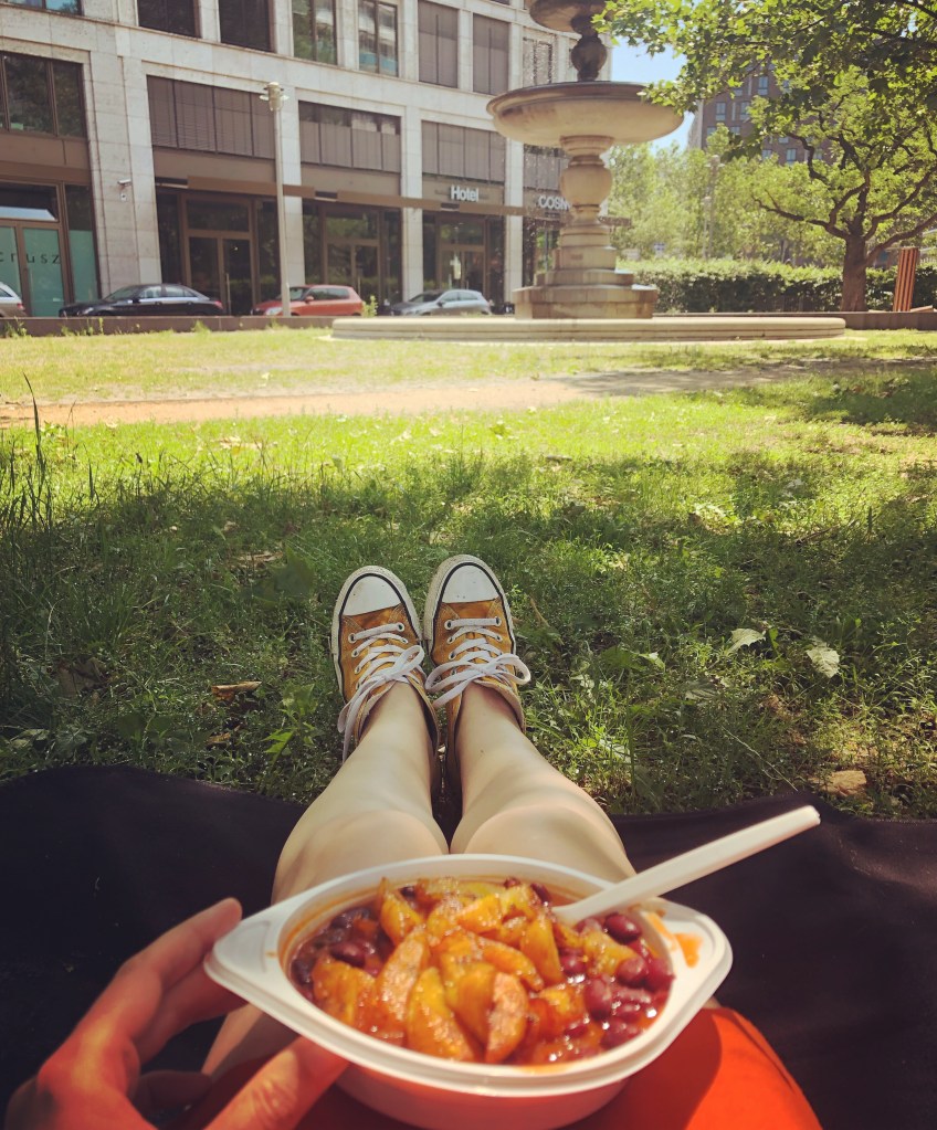 Aufgrund von mangelnder Beteiligung lassen wir die Meditation heute ausfallen, stattdessen geht es direkt zum Streetfood-Markt (Kochbananen und Bohnen von der Kamerunerin) und dann direkt auf die Picknickdecke im Park. Essen, chatten, bloggen, träumen…