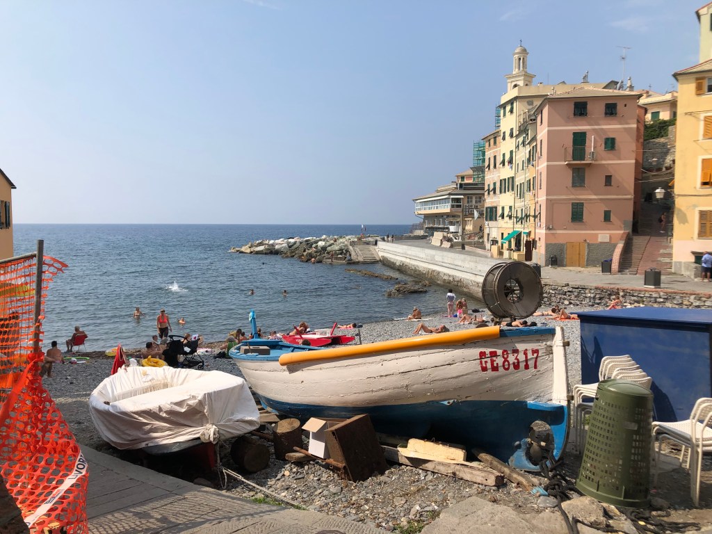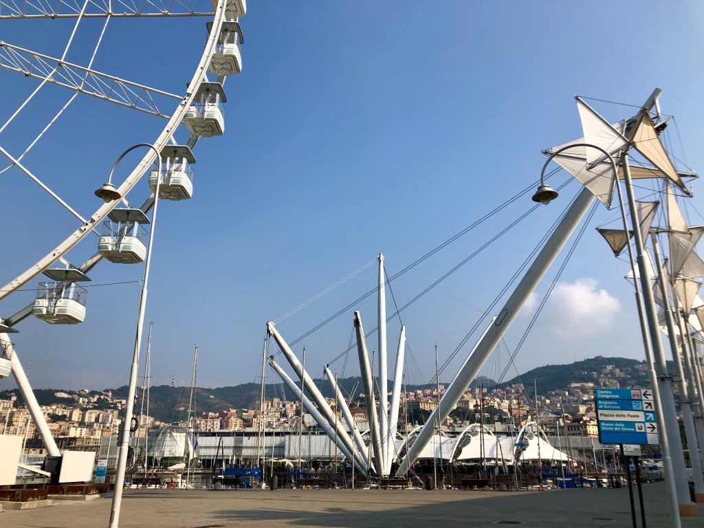 Na gut. Ähnlich wie zuletzt in Berlin auch fast immer, wache ich viel zu früh auf, nämlich um halb 6. Dabei ist es weder im Hostel noch draußen auf der Straße laut. Ich bin halt einfach wach. Versuche zunächst mit einem Podcast und später mit Lesen wieder einzuschlafen, aber das ist mal wieder nicht von Erfolg gekrönt. Zumal ich ja auch in einer mir neuen Stadt bin, die entdeckt werden will! Zunächst gönne ich aber meinem müden Körper noch etwas Ruhe und schreibe meinen Blogeintrag fertig, lese mich durchs Internet, schreibe mit ein paar Freund*innen… Gegen halb 9 stehe ich auf, dusche und mache mich fertig für den Tag. Kurz nach 9 verlasse ich dann das Hostel und laufe zunächst einmal schnurstracks ans Meer, in diesem Fall an den Hafen, der nur wenige Fußminuten entfernt liegt. Leider ist der schöne Naturhafen zugebaut mit Hafenzeugs und der so genannte antike Hafen steht voller moderner Gebäude und Amüsement-Zubehör. Vom Wasser sieht man so gut wie nix. Aber ich wollte ja eh eine ganze Weile laufen und den Corso Italia entlang zum Vor- und Badeort Boccadasse promenieren.