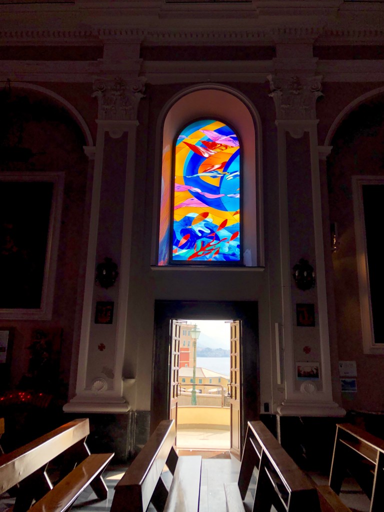 Dann suche ich mir wieder einen Weg nach unten und nach vielem Herumgeirre bin ich dann tatsächlich irgendwann auf dem Corso Italia, der wirklich sehr schön ist und direkt am Meer entlangführt. Es handelt sich dabei vor allem um eine breite Promenade, ohne viel Schatten oder Kioske oder Eisstände oder… Aber halt mit Aussicht auf blaugrünes, glitzerndes tyrrhenisches Meerwasser. Immer geradeaus geht es nach Boccadasse, an dessen Eingang mich die Kirche des Heiligen Antonio von Boccadasse mit einer geöffneten Seitentür und dem Blick auf ein maritim-blaues Kirchenfenster, durch das die Sonne gerade hindurchscheint, empfängt. Fasziniert trete ich ein – normalerweise bin ich ja keine Kirchenguckerin – und mache Fotos vom Kirchenfenster. Dann verlasse ich die Kirche auf der gegenüberliegenden Seite und sehe, dass ich nur ein paar Schritte nach unten gehen muss und schon am Wasser stehe.