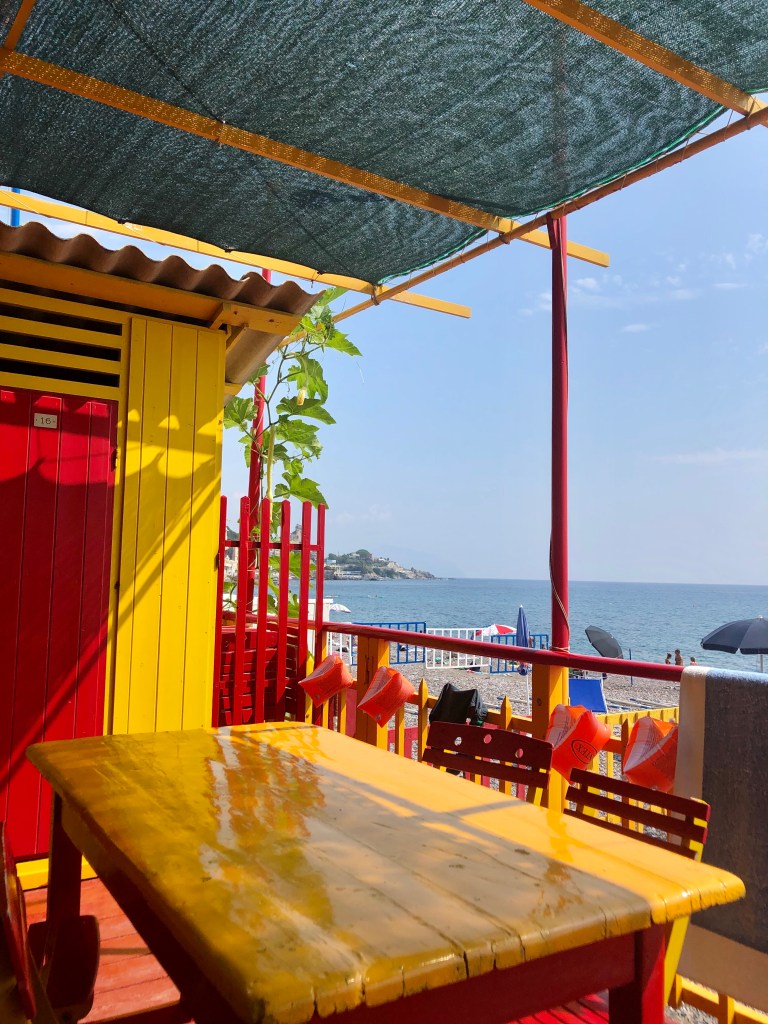 Kurz nach 2 wird es mir zu heiß und trotz mehrfachen Eincremens merke ich, dass der Sonnenbrand naht. Außerdem verspüre ich ein Hüngerchen. Ich setze mich also auf einen unbequemen Plastikstuhl unter das Sonnendach der Strandbar, schlürfe eine Granità mit Minzgeschmack, snacke eine kleine Tüte Kartoffelchips und lese weiter in den „Sternstunden der Menschheit“. Das Meer rauscht weiterhin fröhlich vor sich hin und je später der Tag, desto mehr Wind und damit auch Wellen kommen auf. Gegen 15:30 kommen die ersten Italiener*innen zurück an den Strand, scheinbar ist die größte Mittagshitze offiziell vorbei. Da ich aber weder Flip Flops noch Badesachen dabei habe und also weder ans noch ins Wasser komme, breche ich auf und laufe auf ähnlichen, aber nicht ganz den gleichen Wegen, zurück ins Zentrum. Immerhin kann ich jetzt ab und zu die Schattenseite der Straße nutzen und ein leichtes Lüftchen weht auch, zumindest, wenn ich schnell genug laufe. Die Wellen schwappen schäumend über die Steine am Ufer und alles fühlt sich schön meerig-maritim an auf dem Corso Italia. Meer macht allerdings auch Gedanken, solche, wegen derer ich wieder viel Licht und Liebe nach Irgendwo schicken muss und dann den Schritt noch etwas beschleunigen, damit sie sich nicht festsetzen können.