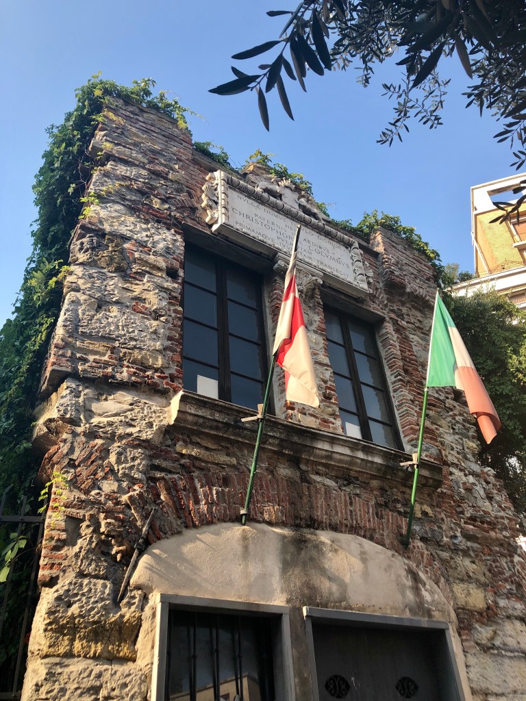 Am Ende des Corso angekommen, wähle ich diesmal eine andere Route und hoffe so, allzu viel Auf und Ab vermeiden zu können. Das klappt auch einigermaßen. Ich laufe stattdessen breite Prachtstraßen unter schönen Platanen entlang, schnurgerade und auch weitestgehend flach. Am Triumpfbogen vorbei geht es unter einem Berg hindurch durch einen Tunnel. Puh. Ich bin ja eigentlich nicht ängstlich, aber so ein sehr langer, glatter Tunnel ist schon etwas beklemmend. Laut, stinkend und eben laaaaaaang. Aber da auch andere Fußgänger*innen dort hindurchliefen, soll das wohl so und irgendwann war auch der Tunnel zu Ende und ich wieder einigermaßen im Zentrum. Dort lief ich vorbei am angeblichen Geburtshaus von Columbus, dem ollen Verbrecher, hinein (und hinauf, leider) in die Altstadt.