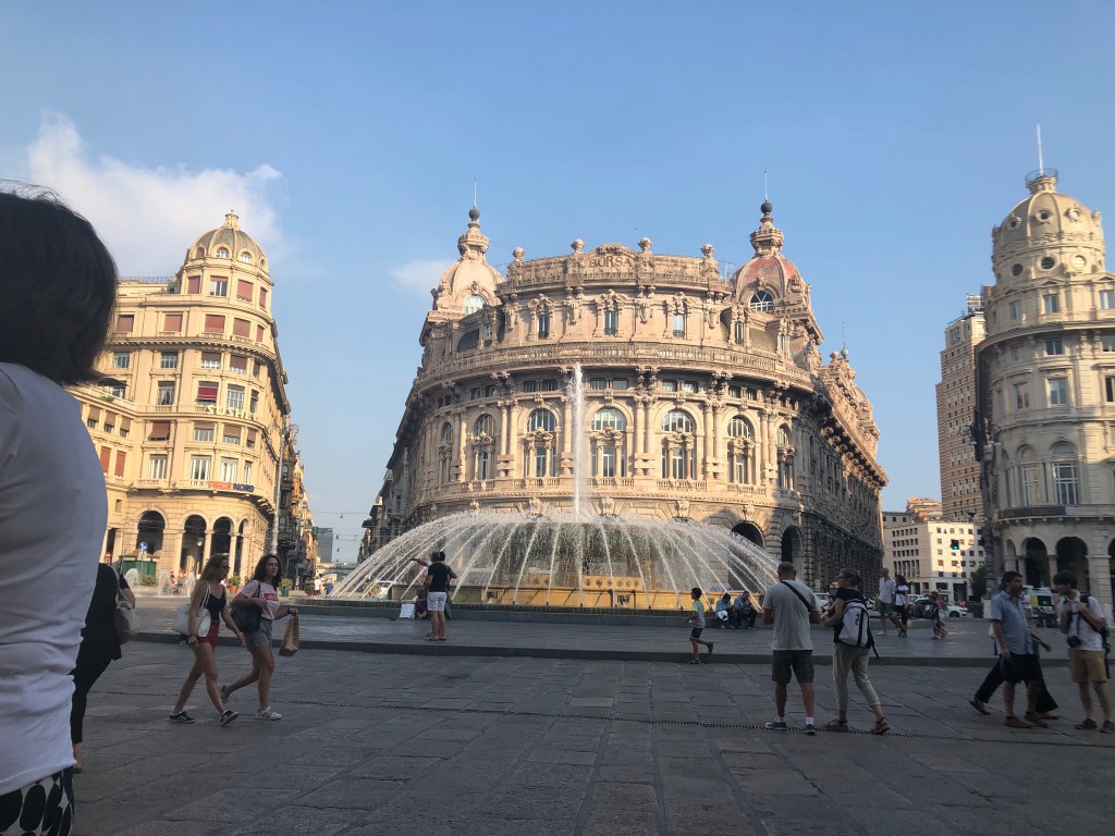 Wieder enge Gassen und niedliche Lädchen und dann große, offene Plätze. Auf der Piazza di Ferrari setze ich mich zunächst an einen riesigen rauschenden Springbrunnen. Doch mit dem sich drehenden Wind bläst der Brunnen plötzlich lauter Wassertröpfchen auf mein Telefon-Display und das ist mir dann doch etwas zu anstrengend. Also setze ich mich dem Brunnen gegenüber auf die Stufen vor dem Palazzo Ducale. Drinnen gibt es kostenlose Kunstausstellungen, gerade unter anderem von De Chirico. Mein Ex-Ex-Freund hätte seine helle Freude daran gehabt, aber da er nicht mit ist, fühle ich mich nicht verpflichtet, hineinzugehen. Stattdessen sitze ich gemütlich auf den Stufen und lese die „Sternstunden der Menschheit“ zu Ende.