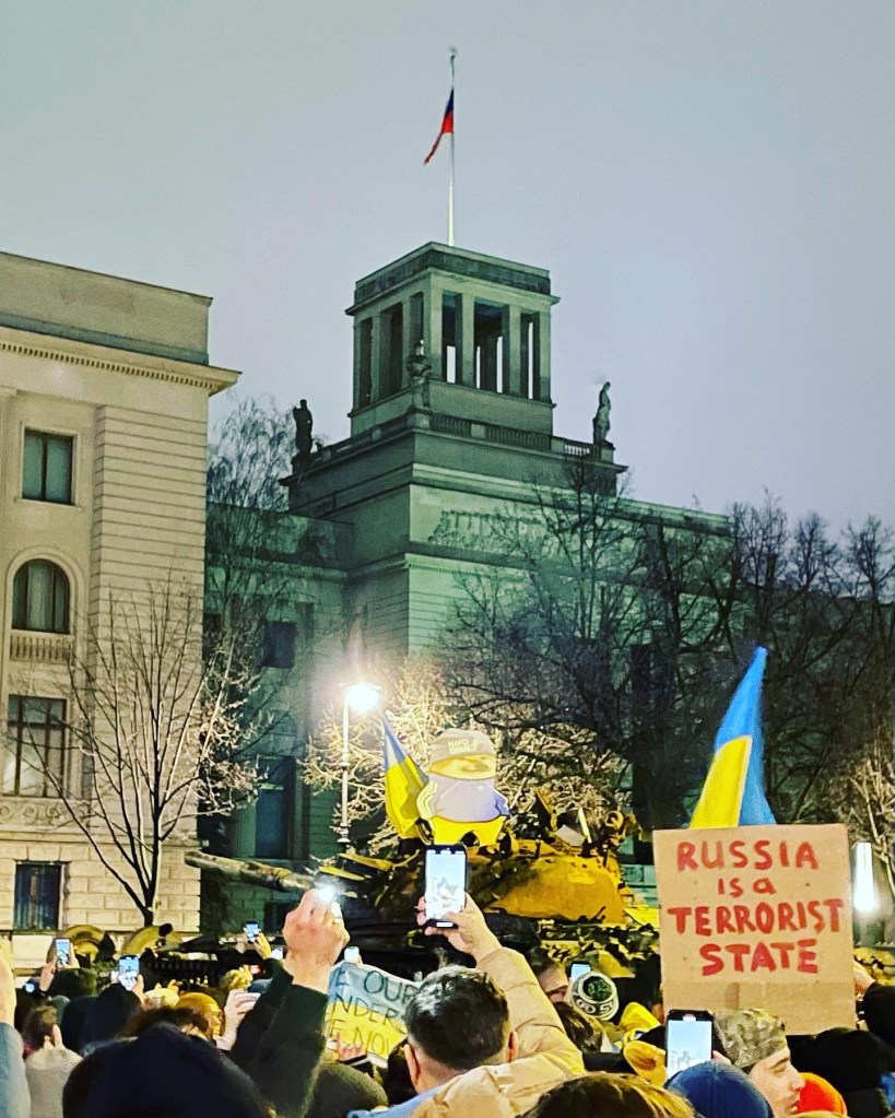 Dann fühlte ich mich gewappnet, wieder raus zu gehen und traf auf Höhe des Neptunbrunnens wieder auf den Demonstrationszug, der sich inzwischen auf den Weg gemacht hatte. Die Linden hinunter und aufs Brandenburger Tor zu, genau wie damals vor 20 Jahren, als wir noch hofften, die USA würden keinen Krieg mit dem Irak beginnen. Damals war ich da auch mit dem Freund, ohne Kinder natürlich noch. Wie verrückt, dass es uns 20 Jahre später aus ähnlichen Gründen wieder auf eine Demo dort verschlug, nur dass es diesmal gegen andere Imperialisten ging. Damals spielte Paddy Kelly bei der Abschlusskundgebung, diesmal gab es eine Videobotschaft von Selenskyi. Die habe ich dann aber nicht mehr mitbekommen. Als wir an der russischen Botschaft und dem russischen Panzerwrack vorbei waren, war mir erstens wieder kalt und zweitens drängte die Zeit bereits.