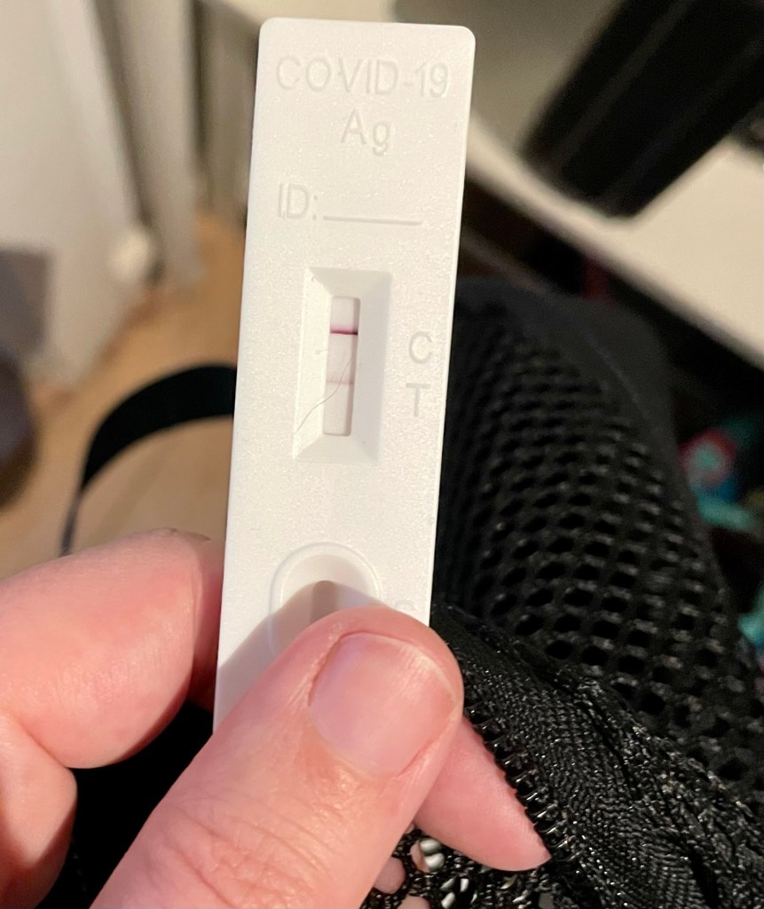 Ich wache gegen 5 Uhr auf und merke, dass etwas anders ist. Mein Hals ist dicker, der Kopf schwerer, die Beine weher. Ich gehe kurz aufs Klo und versuche wieder einzuschlafen, aber das will nicht gelingen. Über die nächsten zwei Stunden beschließe ich nacheinander, dass ich erstens heute nicht ins Büro gehen werde, dann später, dass ich heute gar nicht arbeiten werde. Ich überlege und recherchiere, wie ich mir aktuell eine Krankschreibung besorgen kann (jetzt im März geht das noch telefonisch). Als das Weckerklingeln näherrückt und die Morgenemsigkeit dräut, gehe ich ein weiteres Mal aufs Klo und nehme noch einen weiteren Schnelltest mit.