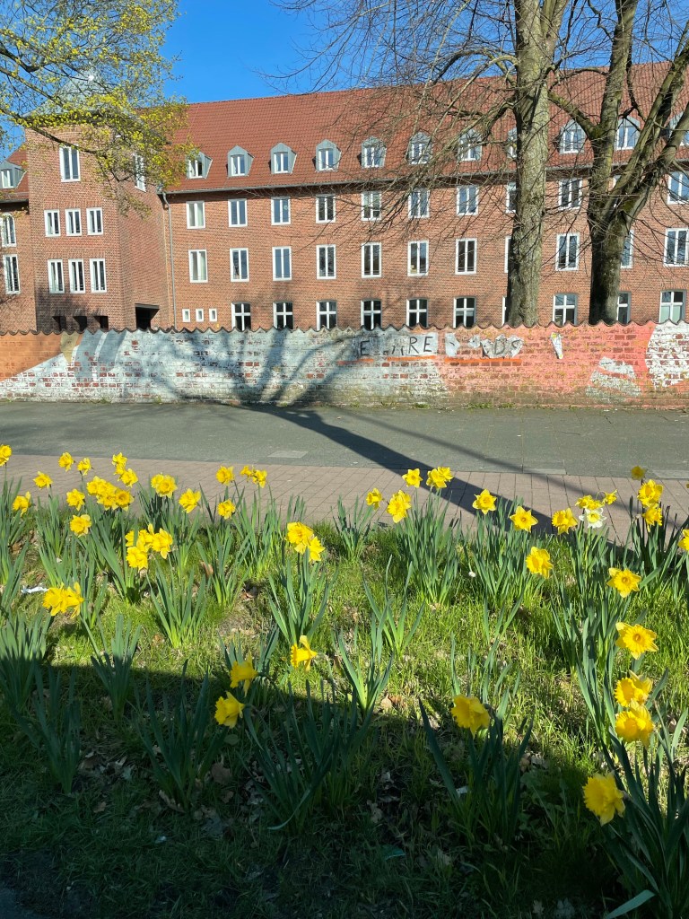 Dann endlich können wir los und fahren eine Stunde über Land in das Heimatstädtchen des Liebsten, wo das Teilzeitkind seine erste (und ich meine zweite) Führung zu seinen frühen Wirkungsstätten bekommt. Wir besichtigen (von außen) die beiden Häuser, in denen er aufgewachsen ist, sehen aus der Ferne seine ersten beiden WGs, erkunden seine Grundschule, das Gymnasium, den Jugendtreff und den Spielplatz, auf dem er als Jugendlicher mit seinen Freund*innen abhing. Er zeigt uns, wo er damals ins Eis eingebrochen ist, wo er in den Fluss gefallen ist, wie er früher über den Magnolienbaum vom Fenster aus auf die Straße geklettert ist, wo er gelernt hat, nicht mit Faschisten zu diskutieren und wo er und seine Klassenkamerad*innen sich künstlerisch auf dem Schulhof verewigt haben.