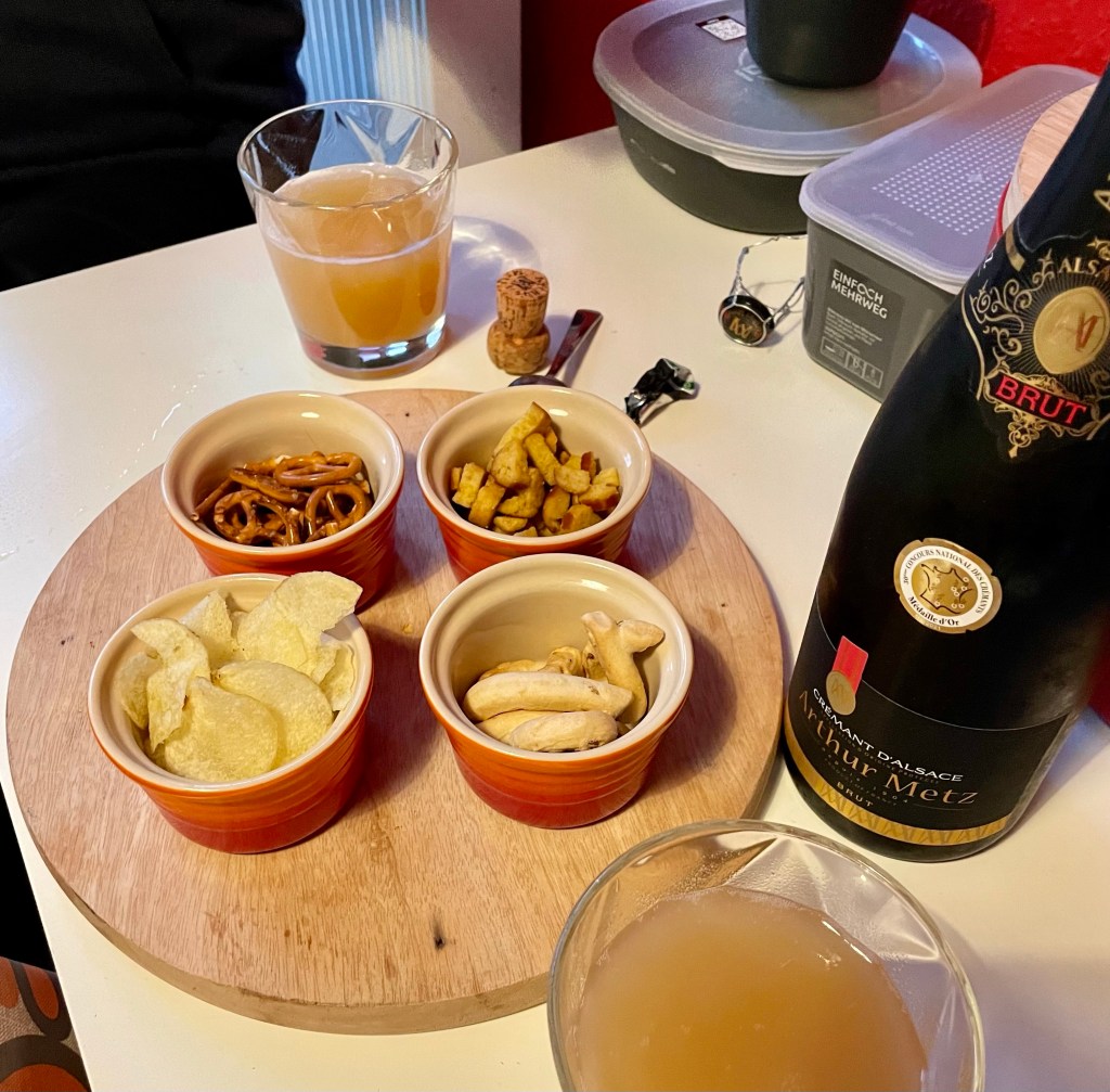 Dann ist der Liebste da und wir nehmen einen stilechten Aperitivo zu uns, während ich das Abendbrot zubereite. Es gibt Bellinis aus Crémant (war halt da) und Weinbergpfirsichpüree – beides Weihnachtsgeschenke von meinem Bruder – und allerlei Knabbereien.