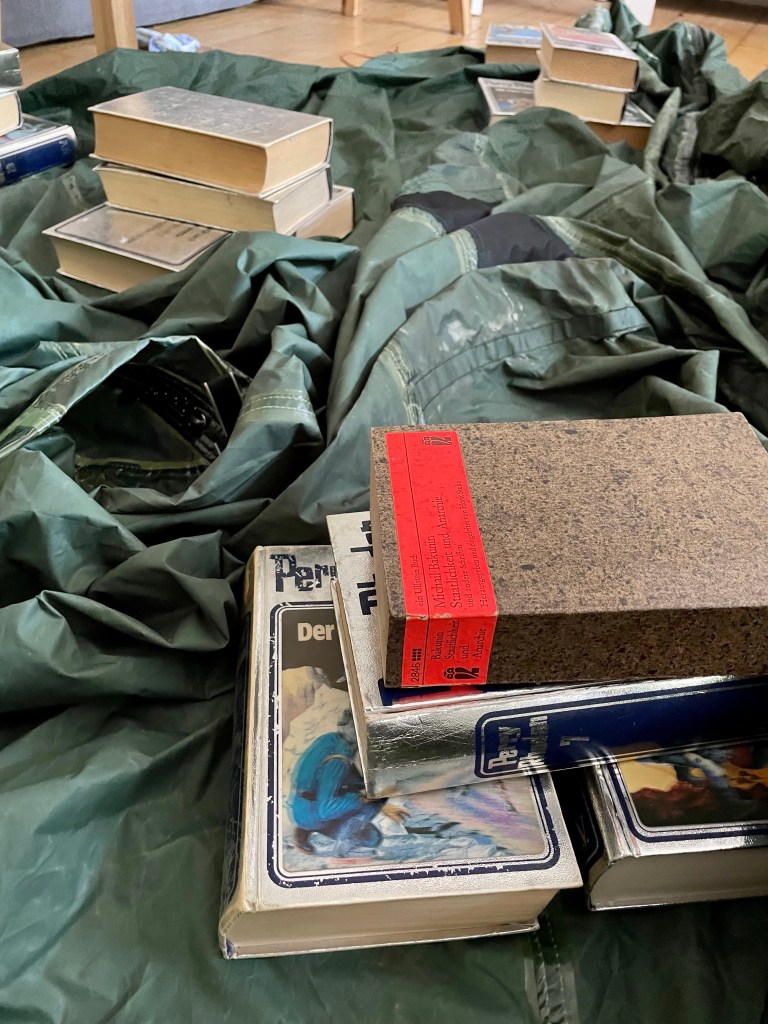 Nach dem Essen haben wir verteilte Aufgaben. Das Teilzeitkind schreibt die Einladungskarten für seine Geburtstagsparty in zwei Wochen, während der Liebste und ich mein Zelt reparieren, mit dem ich am Tag nach der Feier zum Immergut fahre. Dabei kommen Alleskleber und schwere Bücher von Perry Rhodan und Michail Bakunin zum Einsatz.