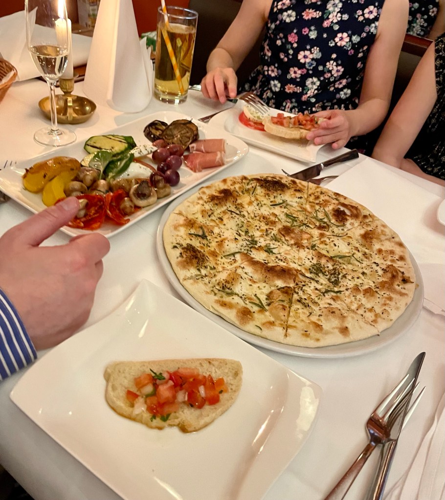 Halb 7 sitzen wir dann mit der Freundin zu viert am reservierten Tisch beim Stammitaliener. Es gibt Antipasti, Bruschetta und Focaccio und danach für die anderen Pizzen und für mich Ravioli mit Steinpilzen. Zum Nachtisch bekommt ein uns gut bekanntes Kind ein gemischtes Eis und besteht aus Gründen darauf, dass ich die Karamellcreme nehme. Die Kids gehen zwischen den Gängen jeweils draußen spielen, so dass wir beim Weinchen auch ein paar Erwachsenengespräche führen können.