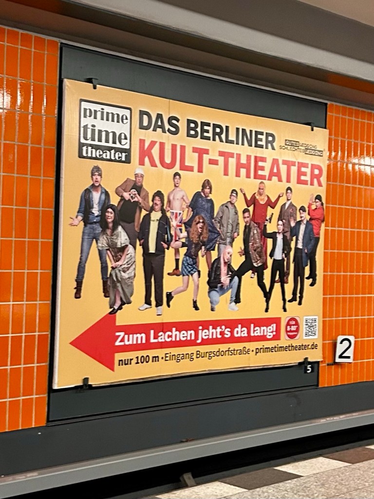 Jedenfalls war ich schon lange nicht mehr im Wedding, jedenfalls nicht nördlich der Ringbahn. Witzig, wie das Publikum in der U-Bahn einfach wirklich aussieht wie der Cast von „Gutes Wedding Schlechtes Wedding”, dessen Plakat ich im U-Bahnhof direkt entdecke. Cool, dass das immer noch läuft. Ich glaube, ich habe zwei Folgen live im Prime Time Theater gesehen und dann die vier, die es mal im rbb gab. Müsste man vielleicht auch mal wieder hingehen, das hat immer viel Spaß gemacht.