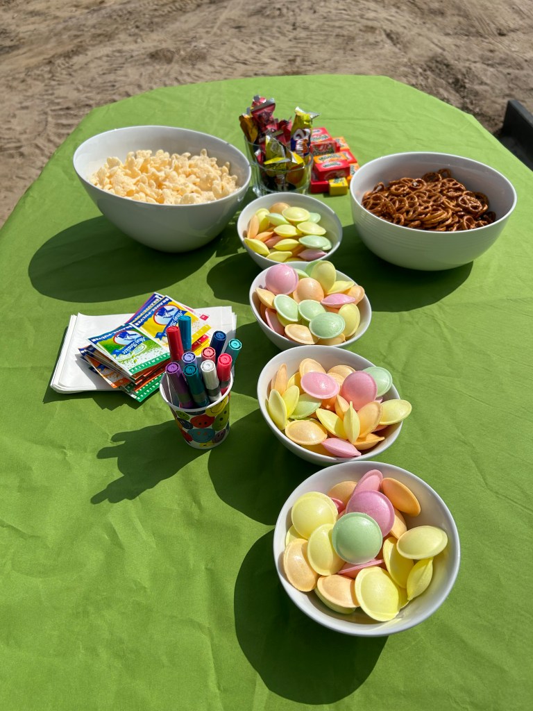 Endlich wird der Schatz gefunden und alle Kinder bekommen jeweils einen Halbedelstein für Zuhause, außerdem stellen sie sich Süßigkeitentüten am Buffet zusammen. Dann werden die Kinder mit Würstchen, Halloumi, Mozzarella und Gemüse versorgt und ich esse auch mit, während bereits die ersten Eltern zum Abholen kommen, aber gerne noch einen Moment zum Quatschen bleiben, während ihre Kids durch die Gegend flitzen und Kontakto (oder Contacto?) spielen. Zwischendurch kommen übrigens auch immer wieder Nachbar*innen vorbei und gratulieren dem Teilzeitkind. Es ist ein Gewusel!