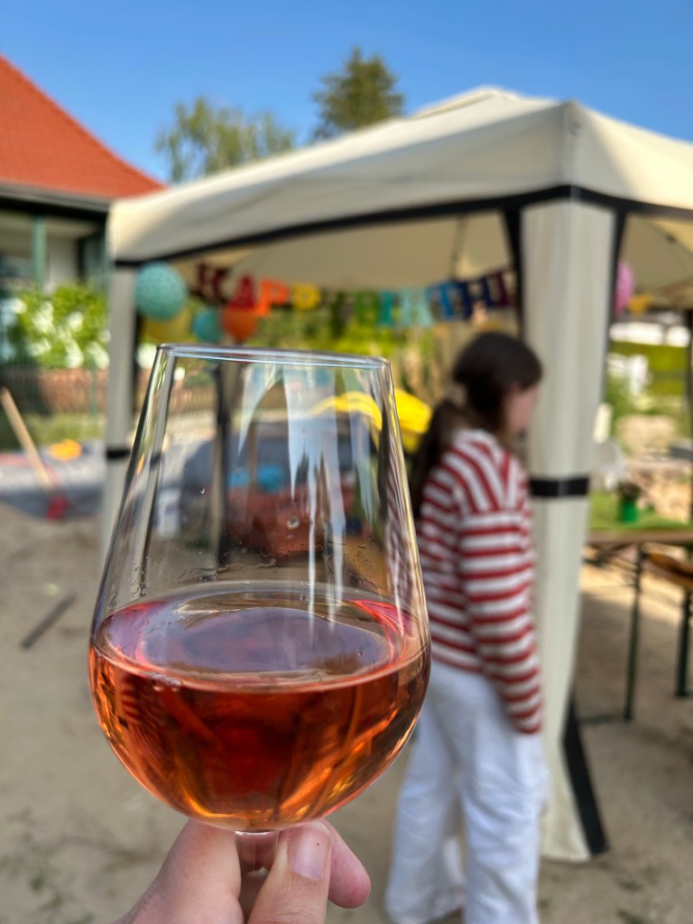 Schon ist es Zeit für die Schatzsuche: Die großen Kinder, der Liebste, ich und die Teilzeitkindmama brechen auf und folgen einem Pfad voller Pfeile, Hinweise, Rätseln und Aufgaben durch die nähere Umgebung. Nach Angaben der Wartenden dauert es fast anderthalb Stunden, bis wir am Ziel – dem Sandhaufen in der Gartenecke – ankommen und die Kinder dort abwechselnd und durch Würfeln bestimmt nach der Schatzkiste graben dürfen. Jetzt ist für mich wieder ein wenig Zeit zum Verschnaufen, Kaffee trinken und ein wenig Kuchen essen – allerdings ist der Grill auch schon an. Ich versorge die Liebsteneltern mit den ersten Würstchen, dann wird noch das obligatorische Geburtstagsfoto des Teilzeitkinds mit den Großeltern und dem Geburtstagszug mit der 10 gemacht, den die Oma extra mitgebracht hat. Das größere Geschwister kommt auch mit aufs Foto – wir sind ja da nicht so. Dann bringt der Liebste seine Eltern wieder zur Bahn – sie sind mit über 80 extra für das Essen gestern und den Geburtstag heute nach Berlin angereist und haben zwischendurch noch einen Freund getroffen (er) bzw. eine Ausstellung besucht (sie). Respekt! Die andere Oma des Teilzeitkinds verteilt inzwischen Rosé an die Erwachsenen, was ich dankend annehme.