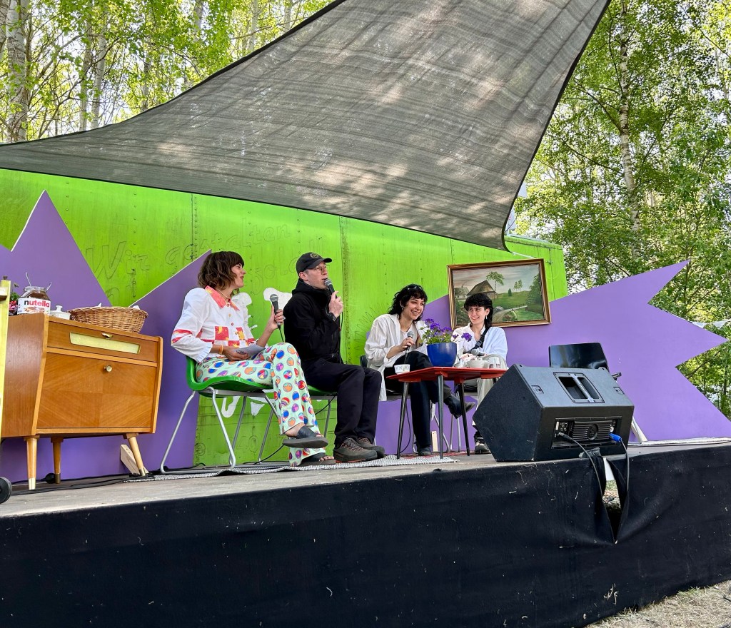 Als es im Zelt dann wirklich zu heiß wird, setze ich mich auf meiner Picknickdecke nach draußen und frühstücke. Es gibt Beerenporridge mit H-Milch und einen Apfel. Dann gehe ich Zähne putzen und mich waschen und ziehe mich für den Tag an. Rund ums Zelt ist es jetzt knalleheiß – ich suche mir jetzt ein schattigeres Plätzchen, das ich auf dem Marktplatz an der Bühne finde. Hier moderieren der wunderbare Sam Vance-Law und eine Frau, deren Namen mir nicht einfällt, eine sehr lustige Frühstücksrunde und interviewen verschiedene Immergut-Mitarbeiter*innen und die Band AZE von gestern. Ich hole mir einen Rooibos-Eistee mit Passionsfrucht in meinen Becher und habe viel Spaß.