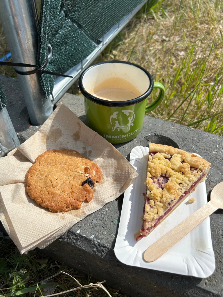 Ich sitze die meiste Zeit mit dem Ex-Kollegen und seinen Kindern beieinander, unterhalte mich, höre den professionellen Kommentaren zu und lache mich wie immer kaputt, trinke eine Rhabarberschorle und blogge nebenher. Nach dem Finale laufe ich zurück zum Festivalgelände, es ist mittlerweile fast 15 Uhr, und mache mich für die Konzerte bereit. Flip-Flops aus, Socken und Sneakers an, Pullover und Jacke in den Beutel (Zahnpasta und Deo raus), Sonnencreme und Mückenspray nachlegen und dann kann es losgehen. Als erstes hole ich mir einen Cappuccino doppio, ein Stück Kirsch-Streusel-Kuchen und einen Physalis-Nuss-Cookie, setze mich damit in den Schatten und lausche der Lesung von Henri Maximilian Jakobs.