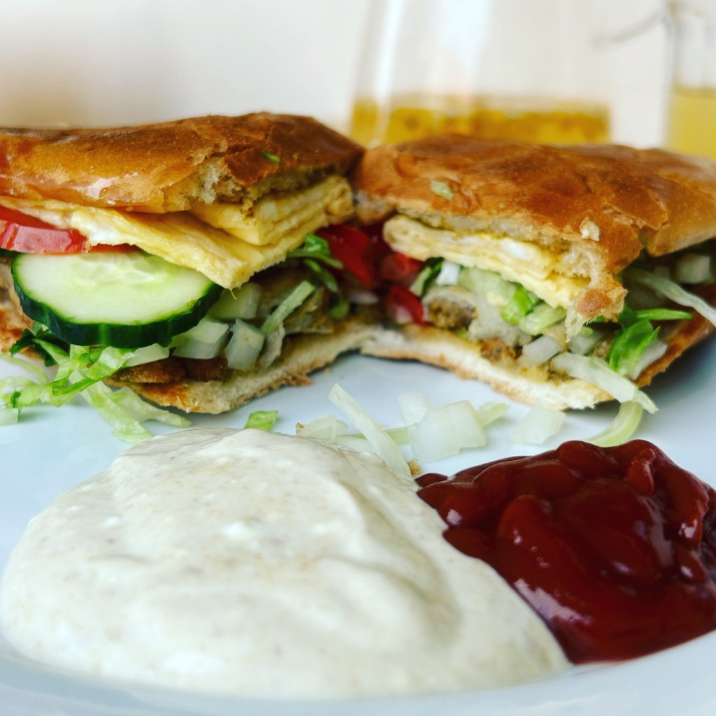 Wieder zurück sitze ich mit Maracujaschorle und TikTok auf dem Balkon. Irgendwann fängt der Mitbewohner an zu kochen – es gibt Heute pakistanische Burger mit Linsen-Kebap, Salat, Zwiebeln, Gurke, Tomate und Ei, die man in eine Mischung aus Koriander-Minz-Chutney, Joghurt und Heinz Ketchup stippt. Wir essen gemeinsam auf den Balkon, dann bricht der Mitbewohner auf zu Freunden.