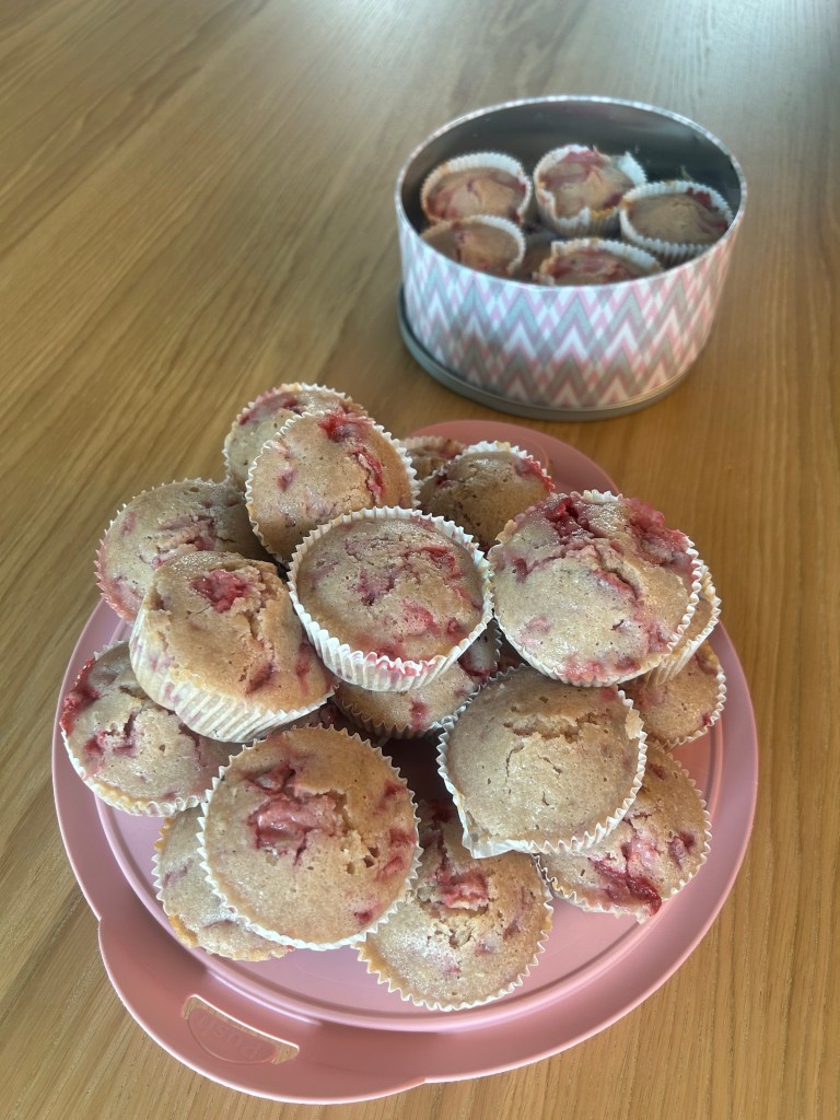 Kurz nach halb 9 komme ich endlich an. Der Liebste begrüßt mich kurz, stellt sich seinen Abendbrotteller zusammen und verschwindet nochmal für anderthalb Stunden in die Schulung. Ich esse gemütlich und mache mich dann daran, 36 Erdbeer-Holunderblüten-Muffins fürs Büro morgen zu backen.