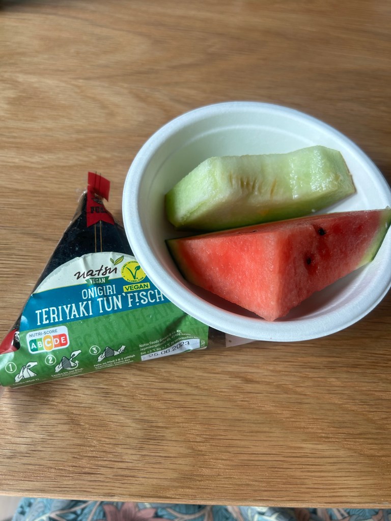 Wie immer an Bürotagen komme ich weniger zum „echten Arbeiten“ als sonst – viele Gespräche mit Leuten vor Ort und heute eben auch noch diverse Nachrichten und sogar einige Anrufe (ein Kollege, der Geschäftsführer und die Freundin meines Bruders) zum Geburtstag. Aber ein bisschen was schaffe ich doch. Ich schreibe das transkribierte Interview in Schön auf, arbeite mit einem Legal-Kollegen in London an einer Freigabevereinbarung, übersetze diese dann ins Deutsche und lasse den Geschäftsführer digital unterschreiben, redigiere einen Text der Kollegin in Georgia, kümmere mich um organisatorische Dinge und führe ein kleines Krisengespräch. Zwischendurch hole ich mit zwei Kolleg*innen noch auf Firmenkosten Wassermelone und Cantaloupe-Melone für alle und bringe mir ein Onigiri mit veganem Thunfisch zum Mittagessen mit.