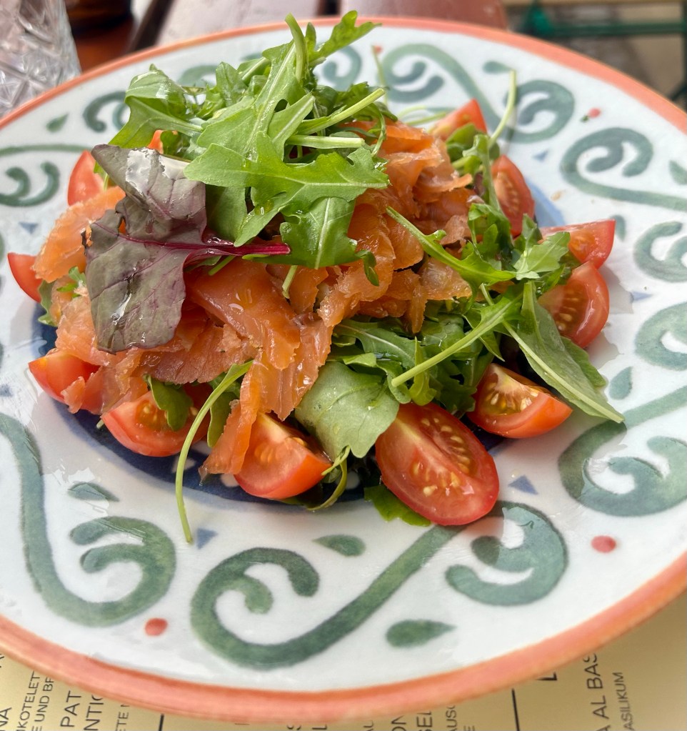 Kurz nach halb 11 sitzen wir im Frühstückslokal. Ich bestelle wie beim letzten Mal einen alkoholfreien Cocktail aus verschiedenen Säften und dazu das Räucherlachsfrühstück mit extra Ei und Crêpes mit süßem Quark. Wir speisen und erzählen gemütlich und haben am Ende (für uns drei Erwachsene überraschend) alles aufgegessen.