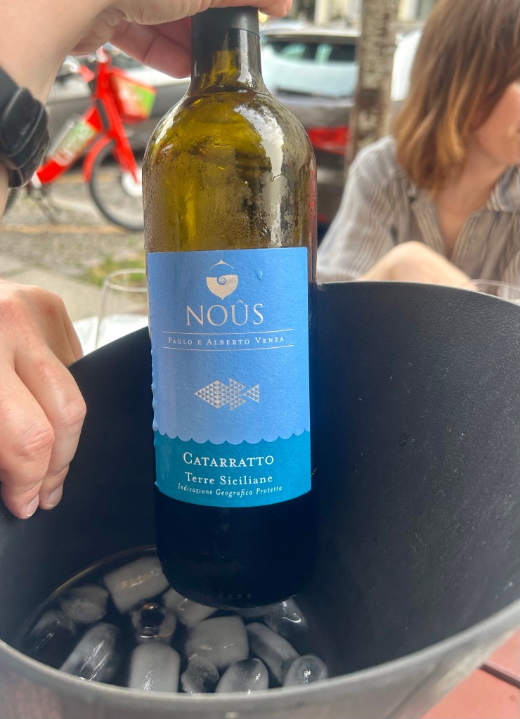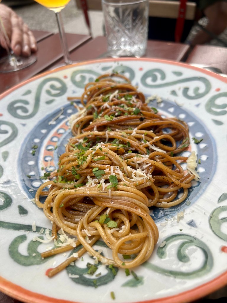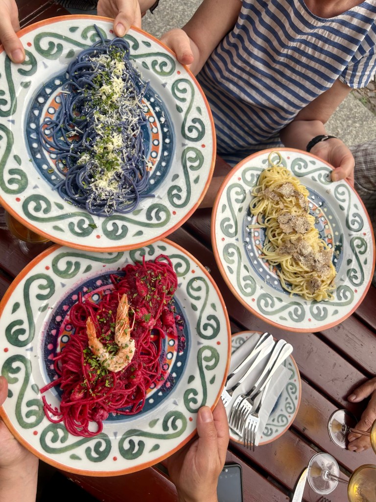 Sizilianischer Natural Wine von der Cataratto-TraubeFür mich: Cacio e Pepe mit mit Clitoria gefärbten Spaghetti, für meinen Papa Spaghetti mit Trüffeln, für meine beste Freundin Spaghetti alle chitarra mit Garnele und roter BeteFür meinen Bruder und den Liebsten gibt es Spaghetti aglio, olio e peperoncino mit schwarzem KnoblauchMeine Mama bestellt das Risotto mit Rotkohl, Gorgonzola und Lauch und hat das einzige nicht perfekte Gericht des Abends – nach dem Nachsalzen war aber auch das sehr lecker