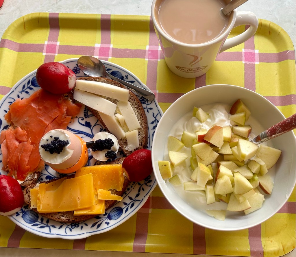 Ich beginne mit gemütlicher Morgenroutine im Bett. Internet leer lesen, Sprachen lernen, Bloggen, mit dem Liebsten telefonieren… Am Ende ist es schon fast Mittag, als ich aufstehe, die Katzen füttere und mir Frühstück mache. Mit dem Tablett (Ei mit Kaviar, Stullen mit Lachs und zwei Sorten Käse, Joghurt mit Apfel, Tee mit Milch) setze ich mich raus auf den Balkon. Der Himmel ist grau und es gibt immer wieder Schauer, die die Luft abkühlen. Ich hole mir eine Strickjacke und eine Decke auf den Balkon, liege im Liegestuhl und lese, während es ein paar Zentimeter weiter in Strömen gießt.