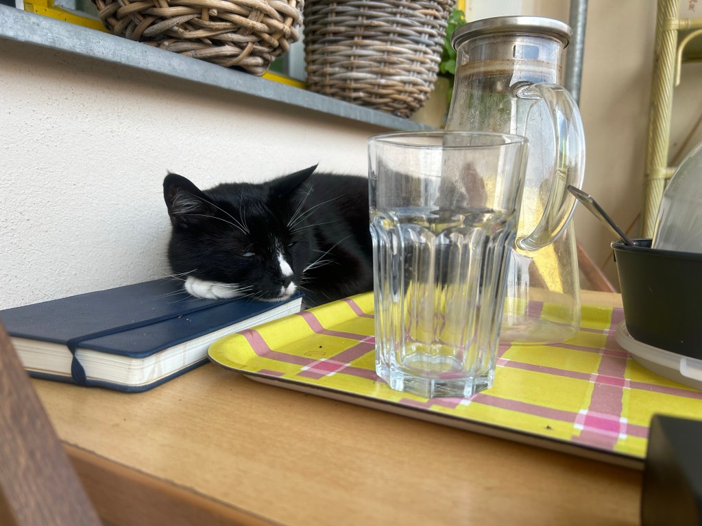 Ich arbeite noch bis 18 Uhr und klappe dann den Laptop zu und baue das Balkon-Office für heute ab. Die Katzen bekommen Abendbrot, ich bediene endlich meine Sprachlern-Apps, telefoniere nochmal in Ruhe mit dem Liebsten, gehe beim Lieblingsnachbarn Blumen gießen und dann mache ich mich wieder zu Fuß und Podcast hörend auf den Weg in eine Kneipe im (erweiterten) Kiez, irgendwo auf dem Hinweg sagt das FitBit Bescheid, dass ich mein Schrittziel erreicht habe.
