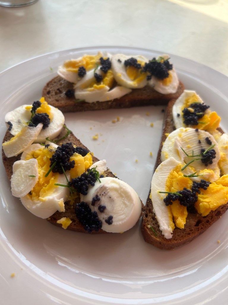 In der Mittagspause befreie ich den letzte Woche angesetzten Holunderblütenzucker von den Dolden, zermörsere größere Klumpen und fülle alles in ein leeres Nutellaglas. Dann esse ich den Rest des Mangosalats von gestern in dem Liegestuhl, in dem ich nicht zur Arbeit sitze – abschalten kann ich. Am Nachmittag mache ich nochmal eine kurze Pause und bereite mir eine Henkersmahlzeit zu, bevor ich dann insgesamt rund 18 Stunden nichts mehr essen darf, weil morgen früh ein weiterer medizinischer Test ansteht. Es gibt Stulle mit Butterschmalz, Ei, Kaviar und Balkonschnittlauch.
