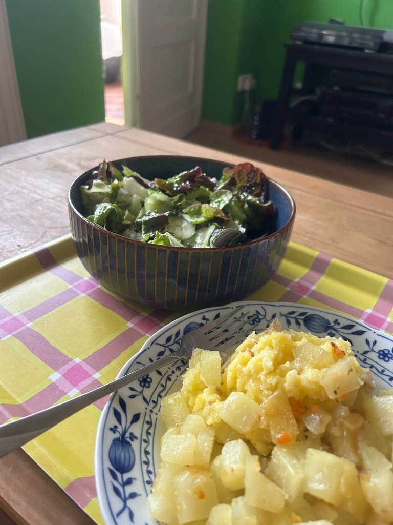 Um 18 Uhr ist Feierabend und genau da schreibt meine Freundin aus Frankreich, ob wir nicht telefonieren wollen und da ich daran auch schon gedacht hatte, sage ich zu. Vorher nochmal kurz virtuelles Abklatschen mit dem Liebsten, der nach einem langen Tag gerade das Teilzeitkind vom Basteln abholt. Dann Telefonat, während ich anfange, meinen Rucksack für morgen zu packen, die Wäsche abnehme, den Müll runterbringe, beim Lieblingsnachbar die Blumen gieße, abwasche und Abendbrot koche. Nach knapp zwei Stunden sind wir fertig und ich esse Kartoffelbrei mit Kohlrabigemüse und Lollo rosso mit Gurken.